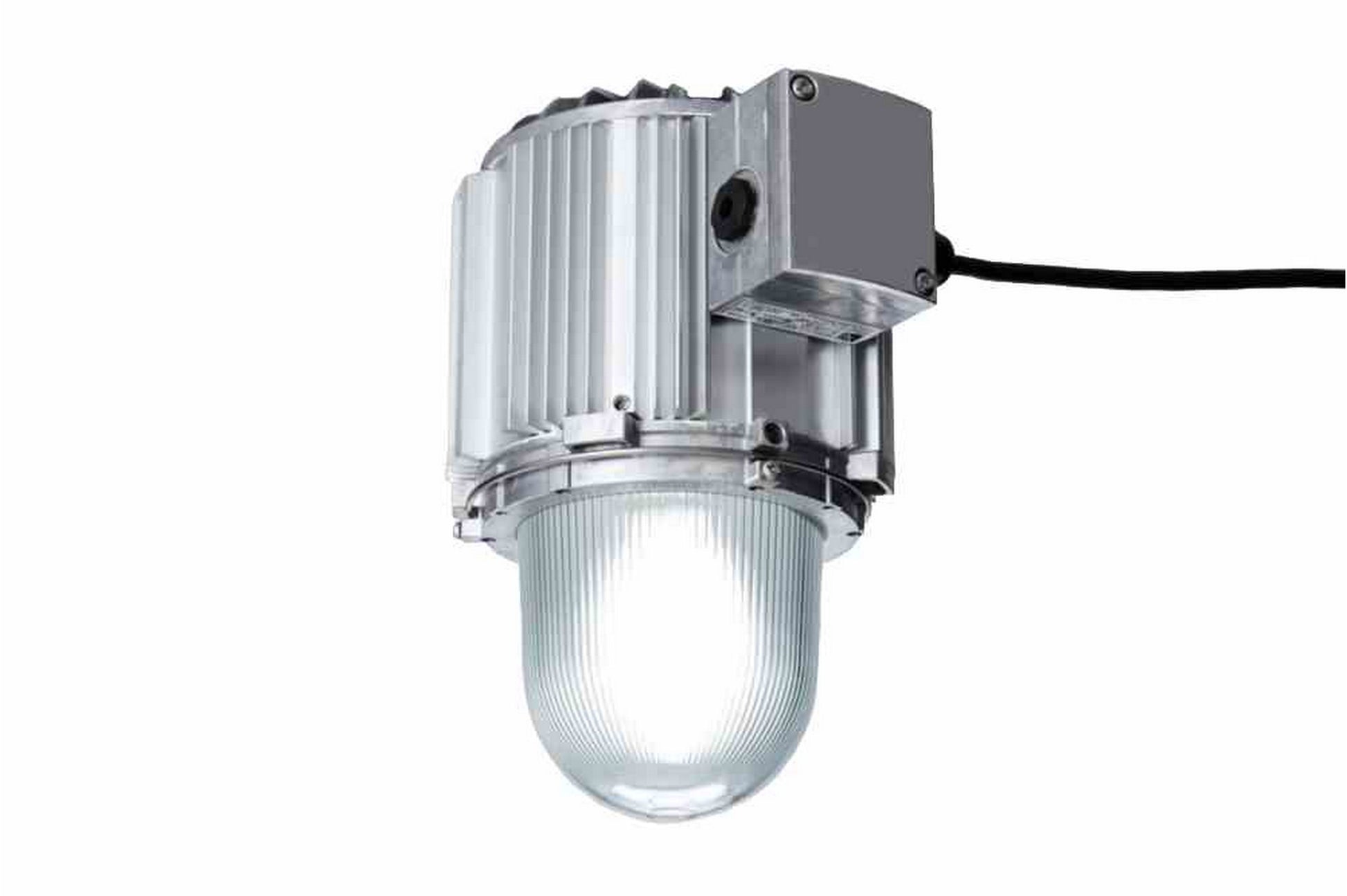 The ATEX-EPL-MJ-60W-230V-PND is an ATEX-rated incandescent fixture for explosive work sites. Equipped with a saltwater resistant housing, this unit operates on 230V 50 Hz. The 60-watt lamp offers 1,080 lumens of output, with a 360-degree beam angle that is highly visible during use. The T4-rated explosion proof luminary is constructed of light metal and protected by a temperature-resistant pressed glass lens. This non-painted unit features an E27 lamp holder and is ATEX rated for Zone 1, 2, 21 and 22.
