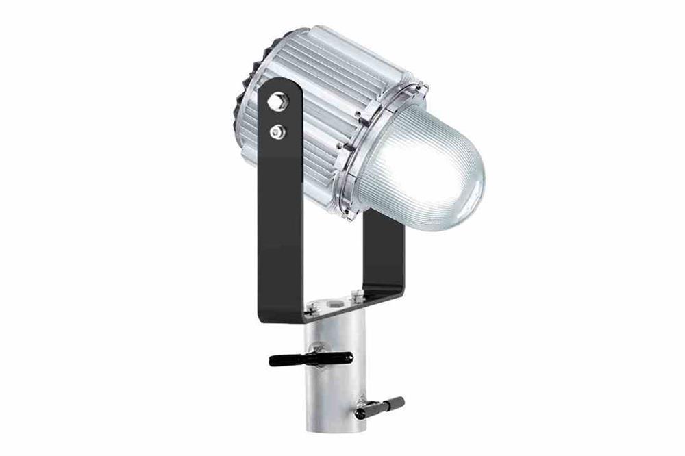 | The ATEX-EPL-PT-MJ-100W-230V Explosion Proof Incandescent Jar Fixture with Pole Top Slip Fitter Mount from Larson Electronics is a powerful incandescent lamp for ATEX-rated environments. This 100-watt fixture is compatible with 230V 50 Hz and offers 360 degrees of illumination. This explosion proof light is equipped with two, threaded 3/4" NPT hubs and constructed of light metal. The ATEX-EPL-PT-MJ-100W-230V is an ATEX-rated pole top slip fit mount incandescent fixture for explosive work sites. Equipped with a saltwater resistant housing, this unit operates on 230V 50 Hz. The 100-watt lamp offers 1,080 lumens of output, with a 360-degree beam angle that is highly visible during use. The T4-rated explosion proof luminary is constructed of light metal and protected by a temperature-resistant pressed glass lens. This non-painted unit features an E27 lamp holder and is ATEX rated for Zone 1, 2, 21 and 22. Wiring/Mounting: Operators are provided access to two threaded 3/4" NPT hubs for wiring connections during installation. This pole top slip fit mount explosion proof light features an adjustable swivel bracket constructed of 3/8" aluminum that allows 270° of adjustment and is attached to a slip fit yoke for easy installation. The slip fit yoke is built to customer`s specs, enabling operators to mount this explosion proof LED light to their specific pole size. For example, selecting a 2" OD mount means that the yoke mount will fit onto pipes or bull horns with a 2" OD. Suggested Applications: Hazardous locations, explosive work sites, confined spaces, chemical processing, food manufacturing and more.  |