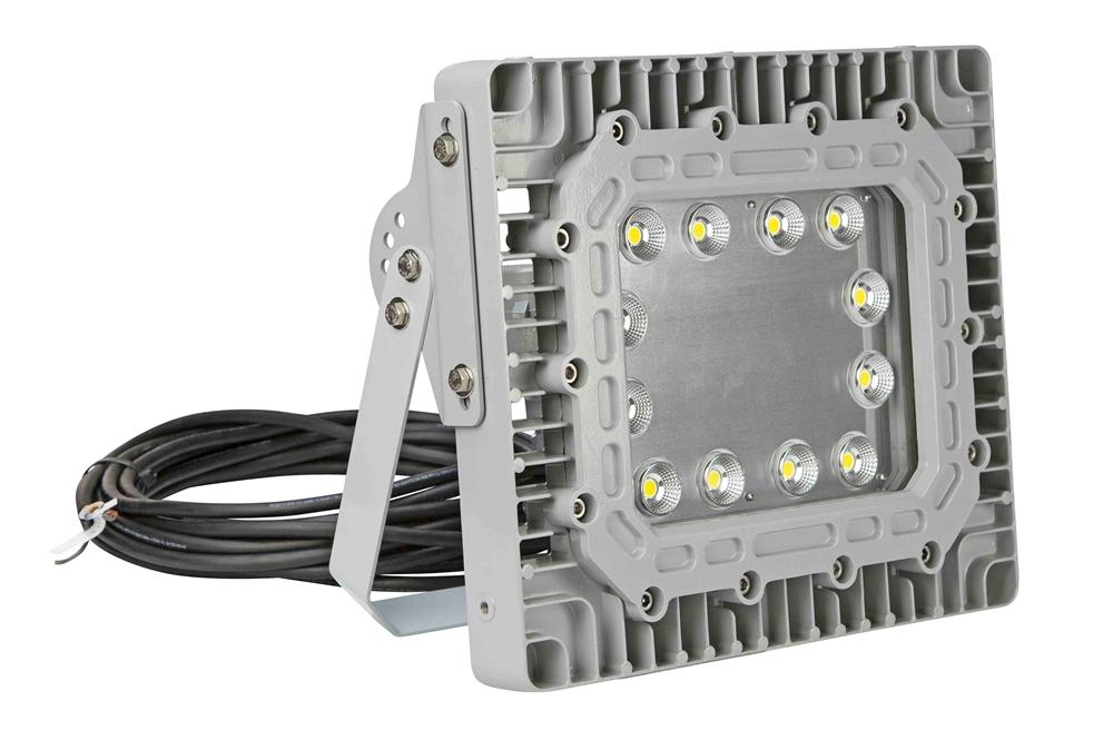 The explosion proof LED light fixture features multiple LED drivers which helps to increase the operational life of the fixture. With traditional LED lights, in the event an LED array or driver fails, the entire fixture no longer illuminates. This new series of LED lamps contains twelve individual LED boards configured in a series of banks. Each bank contains two LED boards with an individual driver. In the event of a driver failure, only one bank of LEDs will be effected while the other banks will continue to operate. In the event that of an LED failure, the mating LED will continue to operate. LED Benefits: Unlike gas burning and arc type lamps that have glass bulbs, LEDs have no filaments or fragile housings to break during operation and/or transportation. Instead of heating a small filament or using a combination of gases to produce light, light emitting diodes (LEDs) use semi-conductive materials that illuminate when electric current is applied, providing instant illumination with no warm up or cool down time before re-striking. Because there is no warm up period, this light can be cycled on and off with no reduction in lamp life. LED lights run at significantly cooler temperatures than traditional metal halide and high pressure sodium lights and contain no harmful gases, vapors, or mercury, making them both safer and more energy efficient. No extra energy is wasted in cooling enclosed work areas due to external heat emissions from bulb type lights, and the operator risks associated with traditional lighting methods, such as accidental burns and exposure to hazardous substances contained in the glass bulbs, are eliminated. In addition, LEDs are also safer for the environment as they are 100% recyclable, which eliminates the need for costly special disposal services required with traditional gas burning and arc type lamps. This light is universal voltage capable and can be operated with 100-277V AC, 50/60Hz. We also offer a low voltage version of this LED fixture that operates on AC/DC voltages from 11-25 Volts. This explosion proof LED light fixture is IP67 rated, dust-proof, and protected against high pressure jets and temporary submersion. The cast aluminum body and LED lamp give this light excellent durability and resistance to vibration and impacts. The housing is specially designed to dissipate heat which increases the efficiency and lifespan of the LEDs and electronics. This LED light produces 14,000 lumens with a color temperature of 5000K and a color rendering index of 75 which produces colors and details much more accurately than high pressure sodium or mercury vapor luminaries. The EPL-HB-100LED-RT-DLC-JB2-40C-BCE offers several mounting options including ceiling mounting, pendant mounting, wall mounting and cable mounting. The standard version of this explosion proof LED fixture includes a pendant mount and a surface mount option. Wiring/Plug: This explosion proof flood light is equipped with a serviceable wiring hub, and 40 feet of 16/3 chemical and abrasion resistant SOOW cord with blunt cut ends for operators to hardwire or terminate their own cord cap.