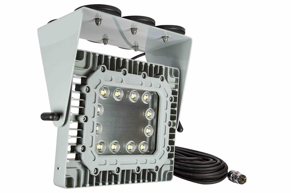 The EPL-MBC-1MLED magnetic mount explosion proof light features an adjustable swivel bracket constructed of 3/8" aluminum. This aluminum mounting bracket has six 200 lbs grip magnetic bases which provide a total of 1,200 lbs of grip and allows operators to mount the unit to ceilings, walls, and any flat metallic surfaces. Users simply attach the magnetic mounting bracket to the desired surface, then hang the lamp assembly from the bracket. The wiring of this portable hazardous location lighting system consists of 100 feet of SOOW cable and is terminated in a 15 amp explosion proof plug. The flying leads allow the user to tap this Class I Division 1 LED light to the desired voltage during installation.