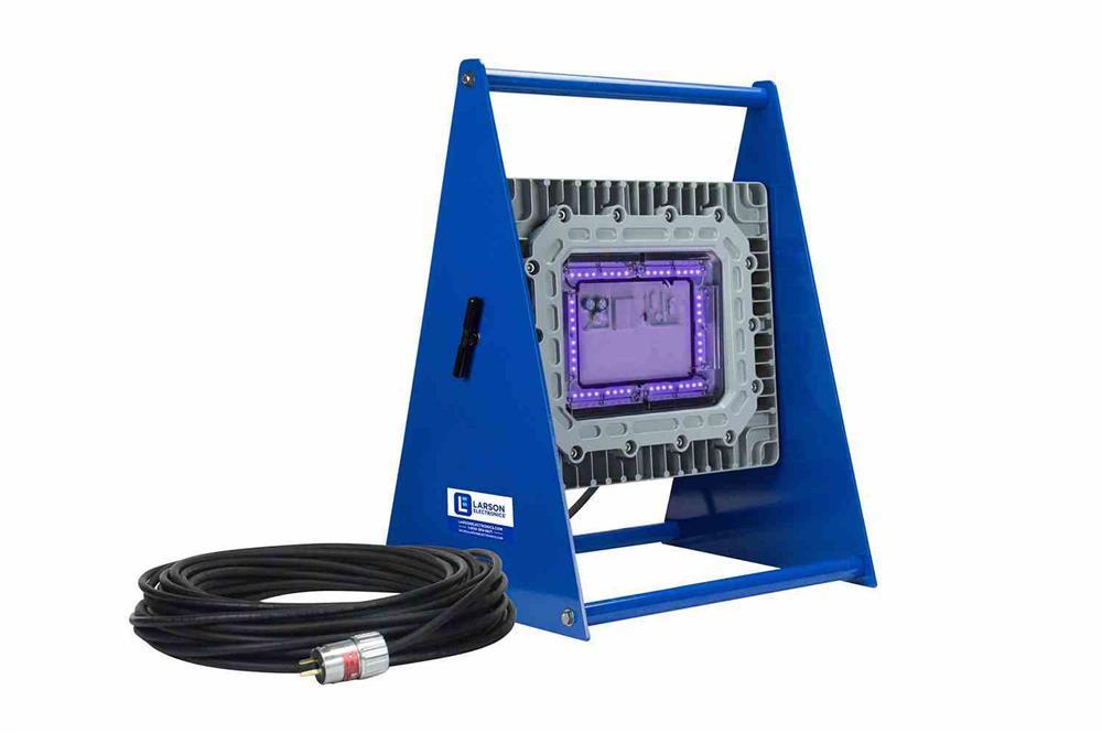 The EPL-PM-100LED-UVA-100 from Larson Electronics is an Explosion Proof Ultraviolet Portable Light Fixture that provides operators with a powerful and energy efficient alternative to traditional hazardous location luminaries with UV cutoff filters. LED technology and compact design makes this lamp an excellent replacement upgrade option for bulky and high maintenance cost older incandescent, metal halide and high pressure sodium lights. This portable UV light fixture is mounted to an A-frame style aluminum base and has an adjustable light head measuring 16 inches wide by 14 inches high. This fixture uses advanced LED light technology to produce ultraviolet light and is T6 rated for hazardous locations where UV lamps are used in paint and adhesive curing, food inspection or for non-destructive testing. This Class I Divisions 1 & 2, Class II Divisions 1 & 2 explosion proof UV light fixture provides 46,550 mW of high quality ultraviolet light while drawing only 150 watts. This portable LED light is mounted to an A-frame style aluminum base and has an adjustable LED light head measuring 16 inches wide by 14 inches high. This high output UV LED fixture provides a 6,384 µW/cm2 center beam maximum intensity at 12" while providing a minimum 2,660 µW/cm2 intensity over a 14" by 14" area. The EPL-PM-100LED-UVA-100 is typically used for curing coatings or adhesives and for non-destructive testing applications. This fixture has been thoroughly tested with the DuPont line of ultraviolet curable paint and primers, accelerating the cure times over metal halide fixtures with surface temperatures as low at 55°F. The copper free aluminum alloy body is powder coated for added durability and an attractive aesthetic appearance. Special heat dissipating design in conjunction with LED technology helps this fixture to achieve an excellent 50,000 hour rated lifespan with 80% intensity retention. Light weight and a low profile make this unit an attractive alternative to larger and heavier older fixtures and requires less hardware to install. This fixture can operate on voltages ranging from 120V-277V 50/60Hz and is ETL approved for use in hazardous environments, paint spray booths, wet environments, and areas where UV lamps are used in paint and adhesive curing, food inspection, and for non-destructive testing. The aluminum A-frame is powder coated with glossy blue finish for corrosion resistances and aesthetics. The lamp can be easily adjusted up or down 90 degrees and locked into position by simply loosening the two hand screws located on either side of the light head and re-tightening them once the desired angle is found.