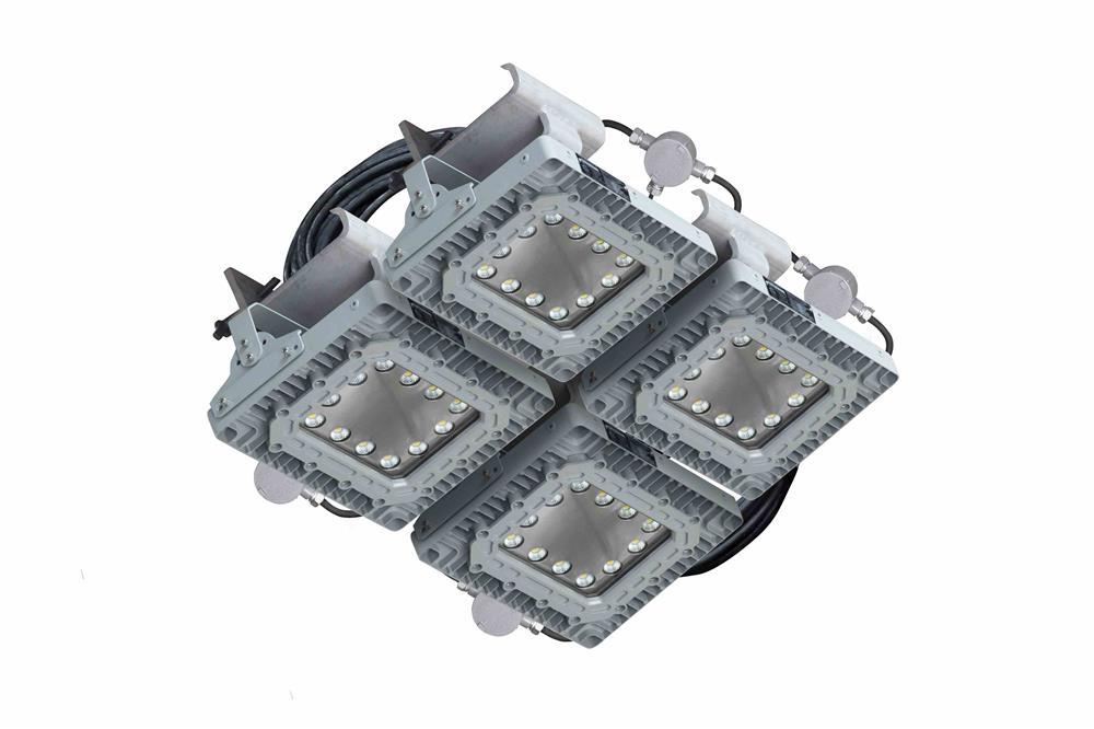 Each explosion proof light fixture provides 17,500 of high quality light while drawing only 150 watts, for a combined 70,000 lumens at 600 watts. Color temperature options include 5000K, 4000K or 3000K. These lights are direct replacement for 400 watt metal halide temporary fixtures. The copper free aluminum alloy body is powder coated for added durability and an attractive aesthetic appearance. Special heat dissipating design in conjunction with LED technology helps these fixtures to achieve an excellent 60,000 hour rated lifespan with 80% lumen retention. Light weight and a low profile makes this unit an attractive alternative to larger and heavier traditional fixtures and requires less hardware to install.