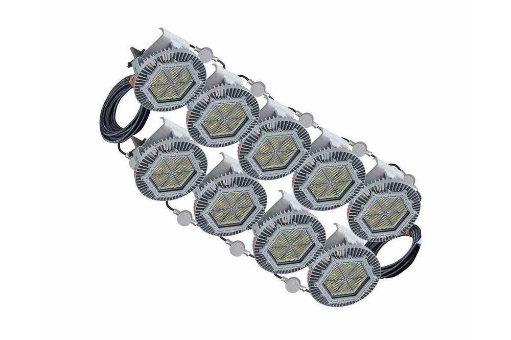 The EPL-SL-9-50X-150LED-B-IBC offers powerful illumination in industrial buildings that work with explosive compounds, including hydrogen (Group B). This 1,350-watt fixture consists of nine LED lamps (150 watts per light) in a daisy chain configuration. During operation, the lighting system provides 90,000 lumens of white light with a color temperature rating of 6,000K. These luminaries are a direct replacement for 400-watt metal halide temporary lamps.