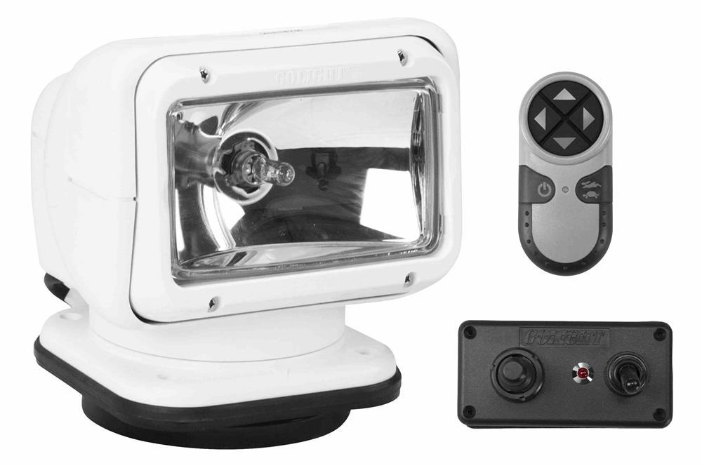 Remote Operation: The wired dash mount remote control has a 20 foot cord that connects the light and remote together. It has a joystick that controls the position of the light. It has dual speed control of the motorized rotation and tilt. The joystick controls the motorized 135 degree tilt of the spotlight and the motorized rotation of the light a full 370 degrees. The light continues to move while the joystick is pressed. Once any button is released, the spotlight remains locked in that position unitl the joystick is moved again. Durability: The GL-2020-M Golight is designed for hunting and demanding outdoor use with a weather resistant housing constructed of high quality ASA Luran thermoplastic that is heat resistant, impact resistant, UV resistant and able to withstand rugged use and abusive conditions. This particular Golight is white in color, making it ideal for docks and buildings where an attractive appearance is desired. Remote movement of this spotlight is provided by an automotive grade internal motor, gear, and transmission assembly that is constructed of LEXAN, brass, and stainless steel to provide rust and corrosion resistance as well as long life and reliable operation. Mounting: The light is magnetically mounted with a 5 inch diameter, 200 pound grip magntic base that is tested for speeds up to 85 miles per hour. The remote is mounted by four screws which are included. Power: This light operates with 12 volts DC and draws 5.5 amps, making it ideal for consumer vehicles, boats, ATVs, and similar sources of 12 volt direct current. On this particular model, a 20 foot harness connects the dash mount remote to the light and splits to connect to the power source. Light Output: The lamp in this Golight is a 65 watt Halogen Cr5 Pentabeam II bulb which produces 1,300 lumens. This lamp has a 6000K color temperature, giving it very good color rendering and contrasting properties and the ability to clearly and sharply illuminate objects at long distances. It produces a long, wide spot beam with an effective working beam 700 feet. This high power Golight is ideal for hunting, security, boating, law enforcement, emergency services, utilities, and anywhere high power and remote control functionality are desired.