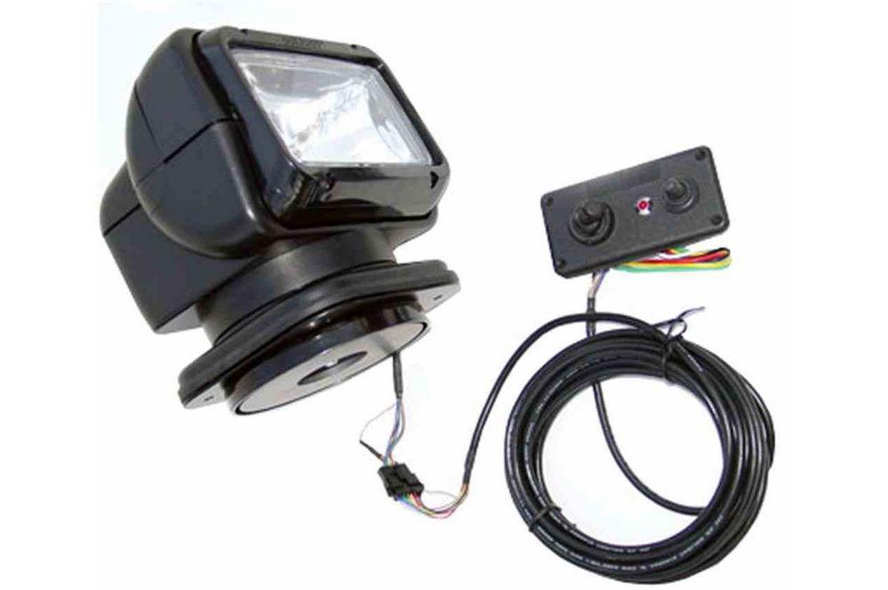 Remote Operation: The wired dash mount remote control has a 20 foot cord that connects the light and remote together. It has a joystick that controls the position of the light. It has dual speed control of the motorized rotation and tilt. The joystick controls the motorized 135 degree tilt of the spotlight and the motorized rotation of the light a full 370 degrees. The light continues to move while the joystick is pressed. Once any button is released, the spotlight remains locked in that position until the joystick is moved again. Durability: The GL-2021-24-M Golight is designed for hunting and demanding outdoor use with a weather resistant housing constructed of high quality ASA Luran thermoplastic that is heat resistant, impact resistant, UV resistant and able to withstand rugged use and abusive conditions. This particular Golight is black in color, making it ideal for docks and buildings where an attractive appearance is desired. Remote movement of this spotlight is provided by an automotive grade internal motor, gear, and transmission assembly that is constructed of LEXAN, brass, and stainless steel to provide rust and corrosion resistance as well as long life and reliable operation. Mounting: The light is magnetically mounted with a 200 pound grip magnetic base that is tested to 85 miles per hour. Power: This light operates with 24 volts DC and draws 2.7 amps, making it ideal for consumer vehicles, boats, ATVs, and similar sources of 24 volt direct current. On this particular model, the light ends in a 20 foot harness connects the dash mount remote to the light. It splits to connect to the power source also.   Light Output: The lamp in this Golight is a 65 watt Halogen Cr5 Pentabeam II bulb which produces 1,300 lumens. This lamp has a 6000K color temperature, giving it very good color rendering and contrasting properties and the ability to clearly and sharply illuminate objects at long distances. It produces a long, wide spot beam with an effective working beam 700 feet. This high power Golight is ideal for hunting, security, boating, law enforcement, emergency services, utilities, and anywhere high power and remote control functionality are desired. This unit produces a more powerful and far reaching beam than halogen spotlights and uses less power on a 24 volt system, making it well suited to vehicles and boats where power supply is limited. Note on Voltage: Most vehicles are 12 Volt DC. 24 Volts DOES NOT mean more power. Running a 24V light from a 12V power source will result in a very dim or non-functioning light, and may cause internal damage to the light as well. For common vehicle use, please order 12V.