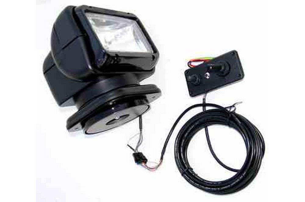 Remote Operation: The wired dash mount remote control has a 20 foot cord that connects the light and remote together. It has a joystick that controls the position of the light. It has dual speed control of the motorized rotation and tilt. The joystick controls the motorized 135 degree tilt of the spotlight and the motorized rotation of the light a full 370 degrees. The light continues to move while the joystick is pressed. Once any button is released, the spotlight remains locked in that position unitl the joystick is moved again. Durability: The GL-2021-M Golight is designed for hunting and demanding outdoor use with a weather resistant housing constructed of high quality ASA Luran thermoplastic that is heat resistant, impact resistant, UV resistant and able to withstand rugged use and abusive conditions. This particular Golight is black in color, making it ideal for docks and buildings where an attractive appearance is desired. Remote movement of this spotlight is provided by an automotive grade internal motor, gear, and transmission assembly that is constructed of LEXAN, brass, and stainless steel to provide rust and corrosion resistance as well as long life and reliable operation. Mounting: The light is magnetically mounted with a 5 inch diameter, 200 pound grip magntic base that is tested for speeds up to 85 miles per hour. The remote is mounted by four screws which are included. Power: This light operates with 12 volts DC and draws 5.5 amps, making it ideal for consumer vehicles, boats, ATVs, and similar sources of 12 volt direct current. On this particular model, a 20 foot harness connects the dash mount remote to the light and splits to connect to the power source. Light Output: The lamp in this Golight is a 65 watt Halogen Cr5 Pentabeam II bulb which produces 1,300 lumens. This lamp has a 6000K color temperature, giving it very good color rendering and contrasting properties and the ability to clearly and sharply illuminate objects at long distances. It produces a long, wide spot beam with an effective working beam 700 feet. This high power Golight is ideal for hunting, security, boating, law enforcement, emergency services, utilities, and anywhere high power and remote control functionality are desired.  Note on Voltage: Most vehicles are 12 Volt DC. 24 Volts DOES NOT mean more power. Running a 24V light from a 12V power source will result in a very dim or non-functioning light, and may cause internal damage to the light as well. For common vehicle use, please order 12V.