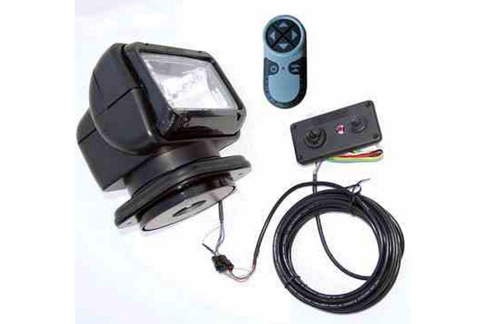 Wired Remote: The wired dash mount remote control has a 20 foot cord that connects the light and remote together. It has a joystick that controls the position of the light. It has dual speed control of the motorized rotation and tilt. The joystick controls the motorized 135 degree tilt of the spotlight and the motorized rotation of the light a full 370 degrees. The light continues to move while the joystick is pressed. Once any button is released, the spotlight remains locked in that position unitl the joystick is moved again.