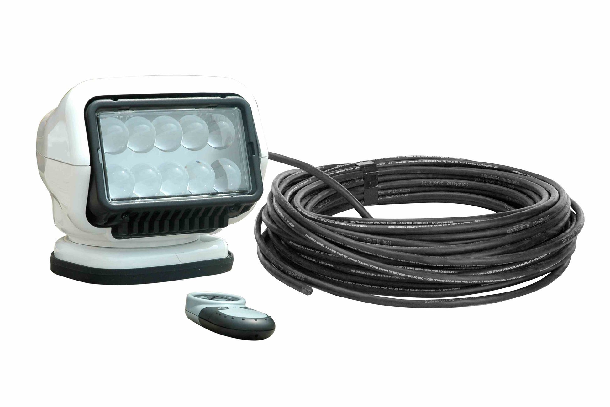 The GL-30004-12.2-30M LED Golight Stryker from Larson Electronics produces a 2,520 lumen light beam capable of reaching over 900 feet in distance. This 36 watt LED Golight offers wireless remote pan and tilt control, a single portable handheld remote control, and a housing finished in a durable white finish. This Golight is weatherproof with a weatherproof remote control and operates with 12 Volt DC via 30 meters of 12/2 SOOW cord with blunt cut ends.