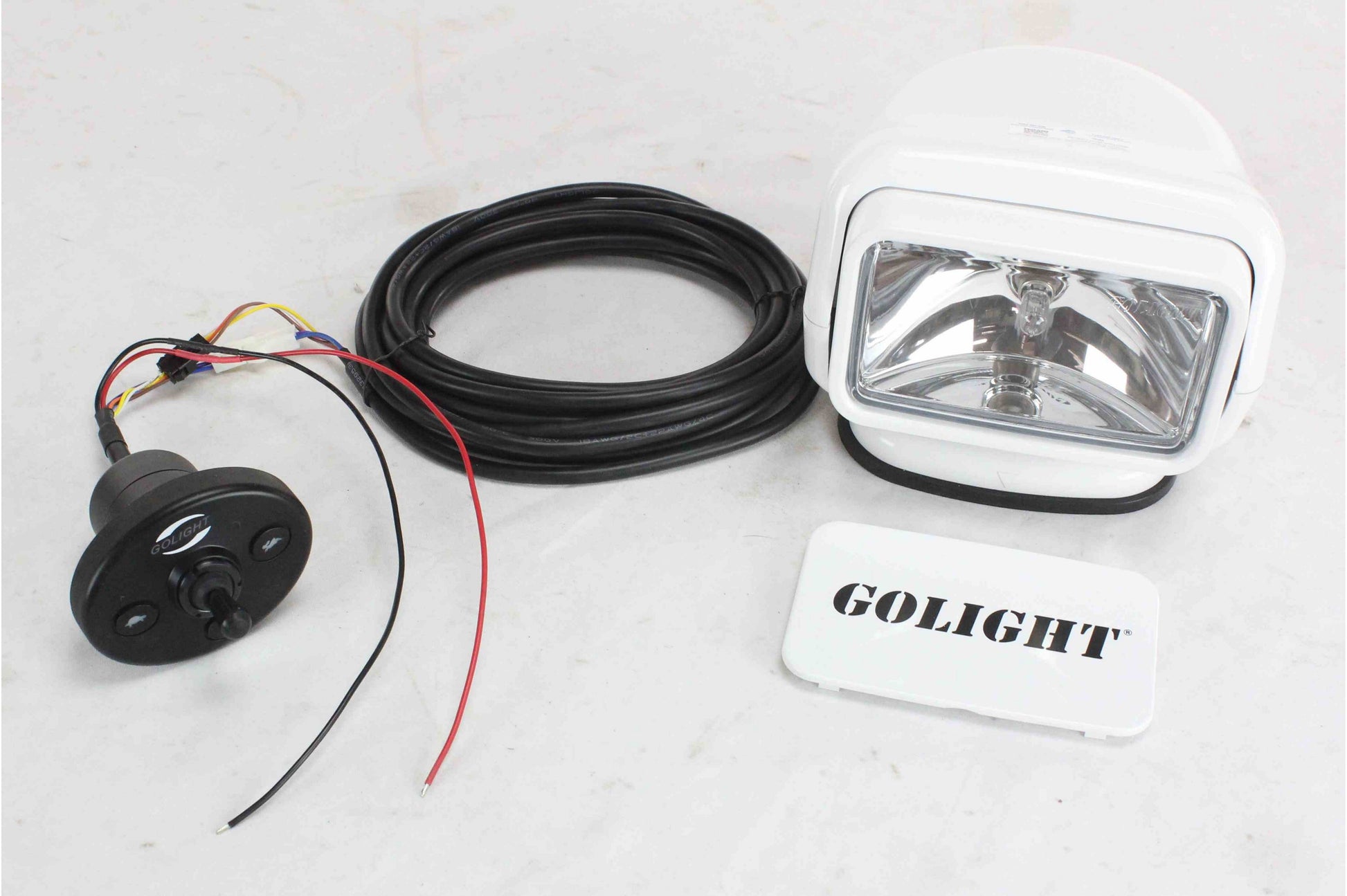 The GL-3020-M Golight Stryker is designed for use in all weather conditions and produces 1,300 lumens of intense light output. These units feature remote control operation that allows users to rotate the light 370 degrees with a hard stop and to adjust vertical tilt through 135 degrees. Remote operation is provided by a hard wired dash mounted remote control. The remote is 4 inches long by 2.5 inches wide by 1/2 inch thick.