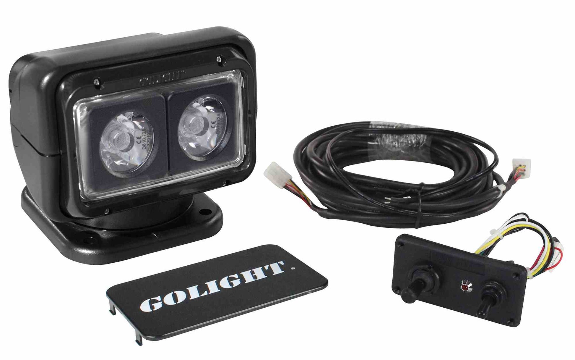 The wired dash mount remote control has a 20 foot cord that connects the infrared light and remote together. It has a joystick that controls the position of the light. It has dual speed control of the motorized rotation and tilt. The joystick controls the motorized 135 degree tilt of the spotlight and the motorized rotation of the light a full 370 degrees. The light continues to move while the joystick is pressed. Once any button is released, the spotlight remains locked in that position until the joystick is moved again.