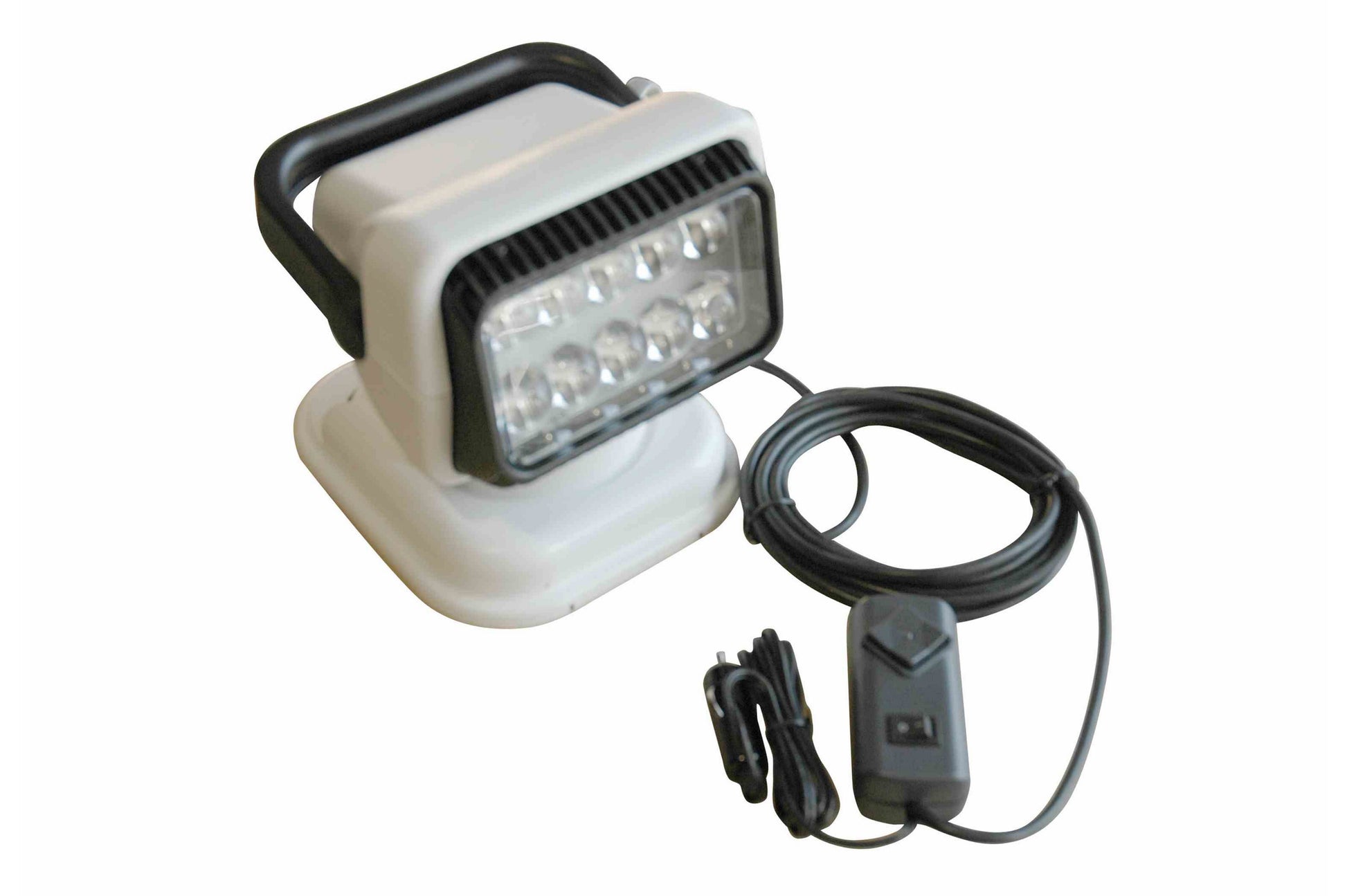 The GL-9167 Golight Radioray from Larson Electronics is a 36 Watt LED motorized spotlight that operates with a hand held wired remote control. This particular model is available in white and has a removable magnetic mount shoe base. It produces a wide spot beam with an effective working beam of 900 feet long by 70 feet wide.