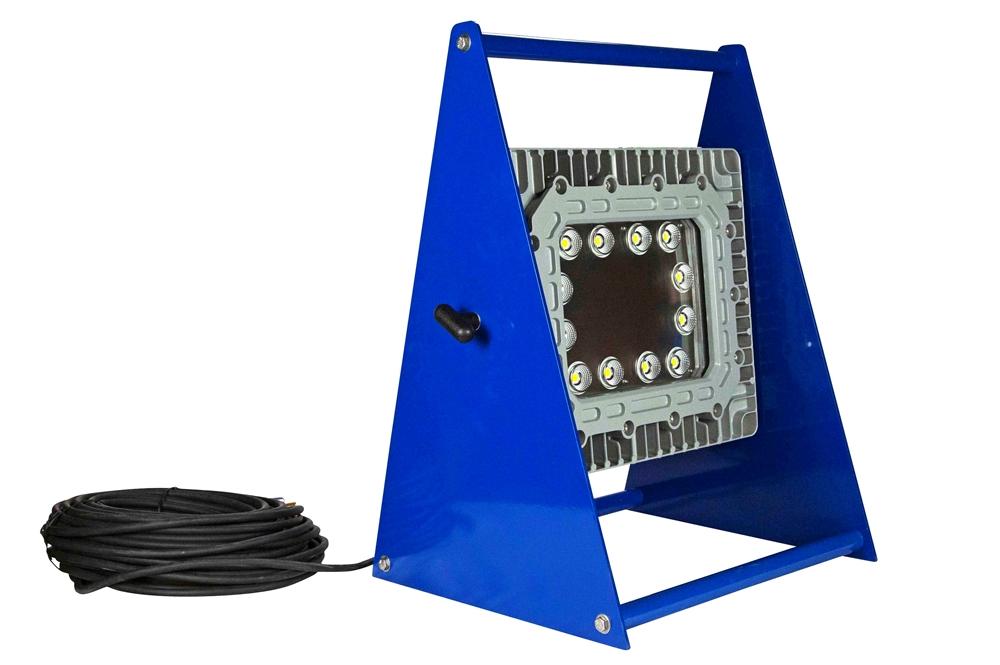 The lamp housing on this unit is weatherproof and constructed of die cast aluminum featuring a hinged, removable front-access door with two captive closure screws for easy servicing and heat/impact-resistant tempered flat door glass. The mounting frame is constructed of aluminum and designed to allow users to simply place the unit on any flat surface for stable deployment. This unit is lightweight and the aluminum frame allows operators to simply carry the unit from one location to another as needed. Included with this light is 100 feet of SOOW cord ending in a standard 1523 explosion proof plug for safe and secure connection. This lamp is suitable for use in areas where flammable petrochemical vapors are sometimes. This light is highly durable, produces high light output in a wide flood pattern, and operates effectively at temperatures to -20 degrees F. This hazardous area light is U.L. rated Class 1 Division 2, Groups A B, C, D and UL1598 listed for Outdoor Salt Water Marine use. This unit operates with 120 VAC and all electronic components are protected within the weatherproof IP 65 rated housing.