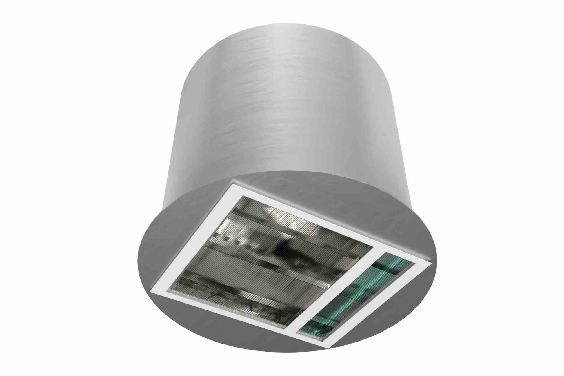 The IND-AHC-CR-12-UVC-R1-120V can be installed on canopies, openings or ceilings (such as elevators) for use with existing air systems. This unit is compatible with 12" OD openings.