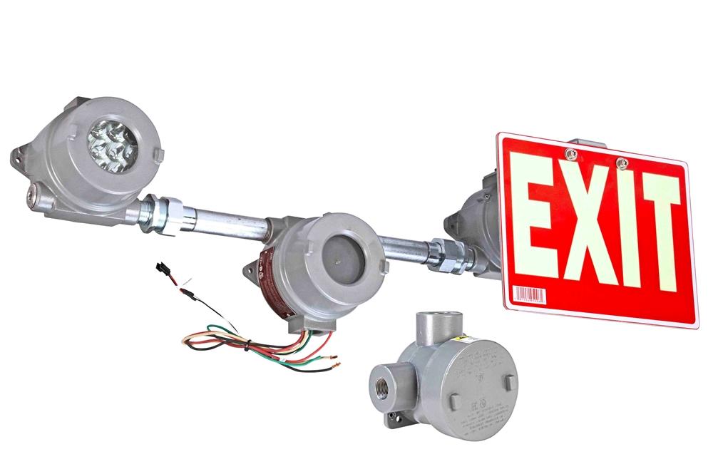 Mounting: The IND-EMG-EXT-LE6-2L-RH is designed to be surface mounted to flat surfaces such as walls. The unions connecting the upper lamps to the lower indicator light enclosure allow for both horizontal and vertical adjustment. This gives operators the ability to adjust the light to their specific mounting location for ideal light coverage during a power failure or power outage.