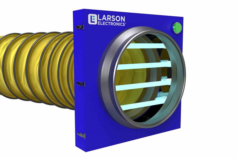 This unit is Made In USA - Manufactured in Texas The Larson Electronics IND-FDP-BXC-16D-18-4L-R1-N3R-120V-50C UV Air Sanitizer for Inline Fan continuously cleans moving air in ducts and fan systems. Equipped with four germicidal UV lamps, the unit offers UV-C output at a range of 200nm - 280nm (254nm) and is installed between the ductwork and portable fan. The UV system is made out of powder coated aluminum and carries a NEMA 3R rating for use in both indoor and outdoor locations. This device is suitable for 16" ducts. *Please note: This product produces UV light. Make sure to follow all safety guidelines and protocols found in the user manual. UVC light in the proper setting kills up to 99.9% of viruses, mold, spores and bacteria. * The IND-FDP-BXC-16D-18-4L-R1-N3R-120V-50C is a powerful sanitation solution for cleaning circulating air from inside ducts connected to inline fans. Equipped with four UVC fluorescent lamps, this system offers UV output, within the 200nm - 280nm UV-C range (254 nm). The lights have an expected lifespan of 8,000+ hours and emit a flood beam pattern with 360 degrees of coverage. Suitable for cleaning both intake and exhaust air, this UV germicidal system is compatible with 16" ducts and up to 2,000 CFM. The UV device is made out of aluminum with a powder coated blue finish for durability. A NEMA 3R rating allows the unit to be used in both indoor and outdoor locations. An external indicator light turns on when the unit is in use to safely notify the operator about ongoing sanitation inside the duct. Operators are provided access to an external power switch for activation at safe distances. The UV light in this system can disinfect over 99% of bacteria and viruses, as well as kill 99% of viruses, bacteria, mold and spores. Voltage: The IND-FDP-BXC-16D-18-4L-R1-N3R-120V-50C operates on 120V AC.