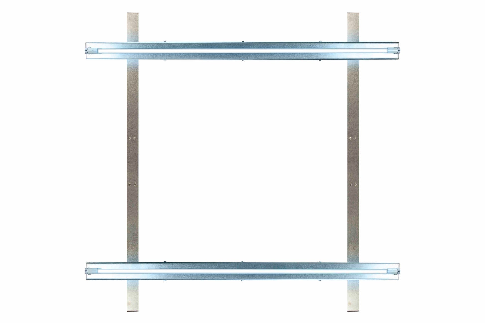 The IND-HVAC-ACC-R1-SS-48-2L-58.40-XB is designed to be mounted inside 58" x 40" condenser and/or evaporator coils of HVAC systems. For best results, the lamps should be installed 12" away from the coils (not adhering to this distance may require more UV lamps to cover the area). A galvanized steel mounting rack with two uprights are available for securing the fixtures. Two included hardware kits can be used to add the lights to the mounting rack.