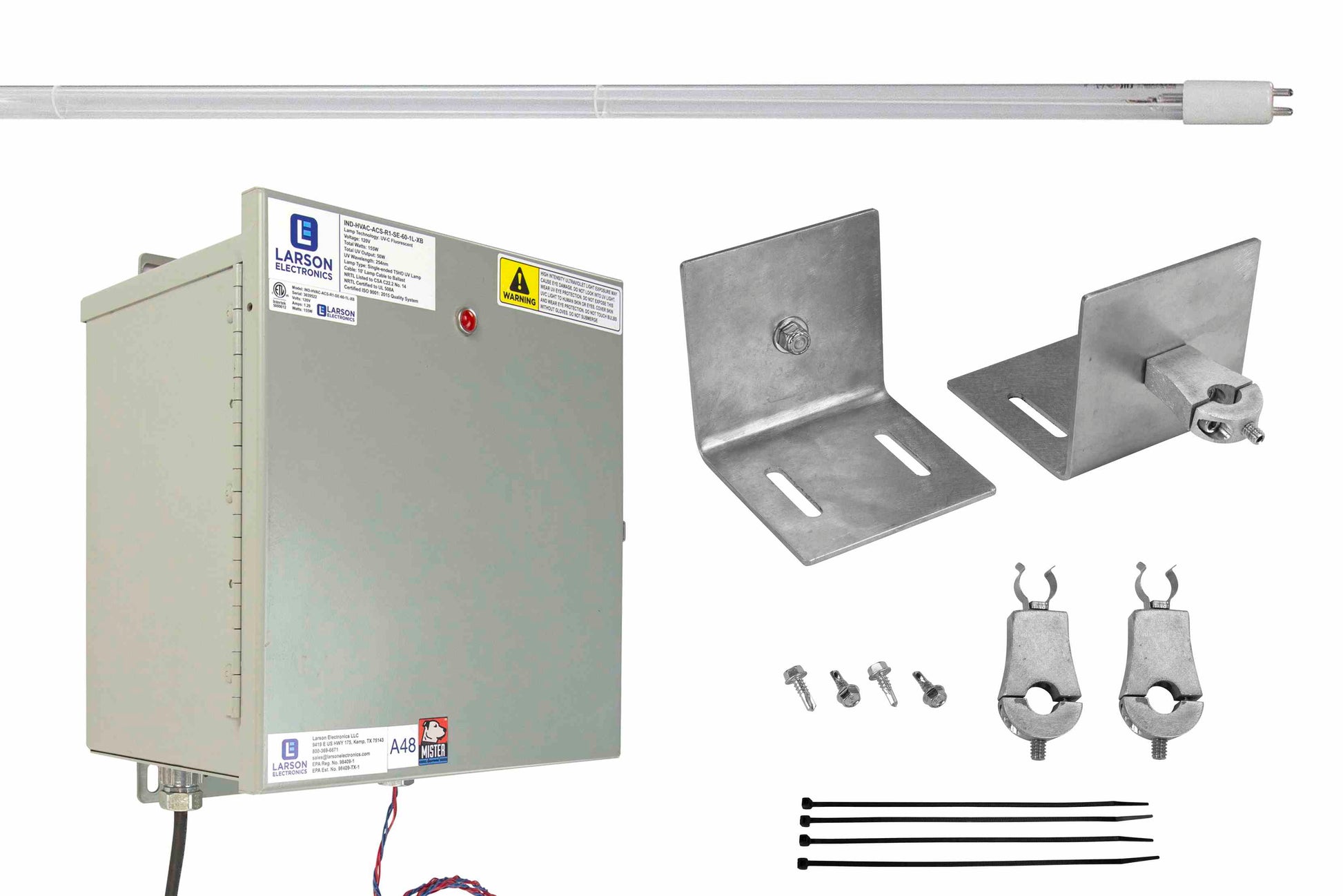 The IND-HVAC-ACS-R1-SE-60-1L-XB-SPF AC Coil Sanitation Bolt-in Kit from Larson Electronics prevents bacterial and unwanted growth in AC condenser coils. AC cleaning is facilitated by one 60" UV lamp. Mounting hardware, UV warning sticker and power supply are included with the kit. The UV fluorescent lamp features a shatterproof coating to prevent exposure to chemicals and glass going everywhere in the event a lamp breaks.
