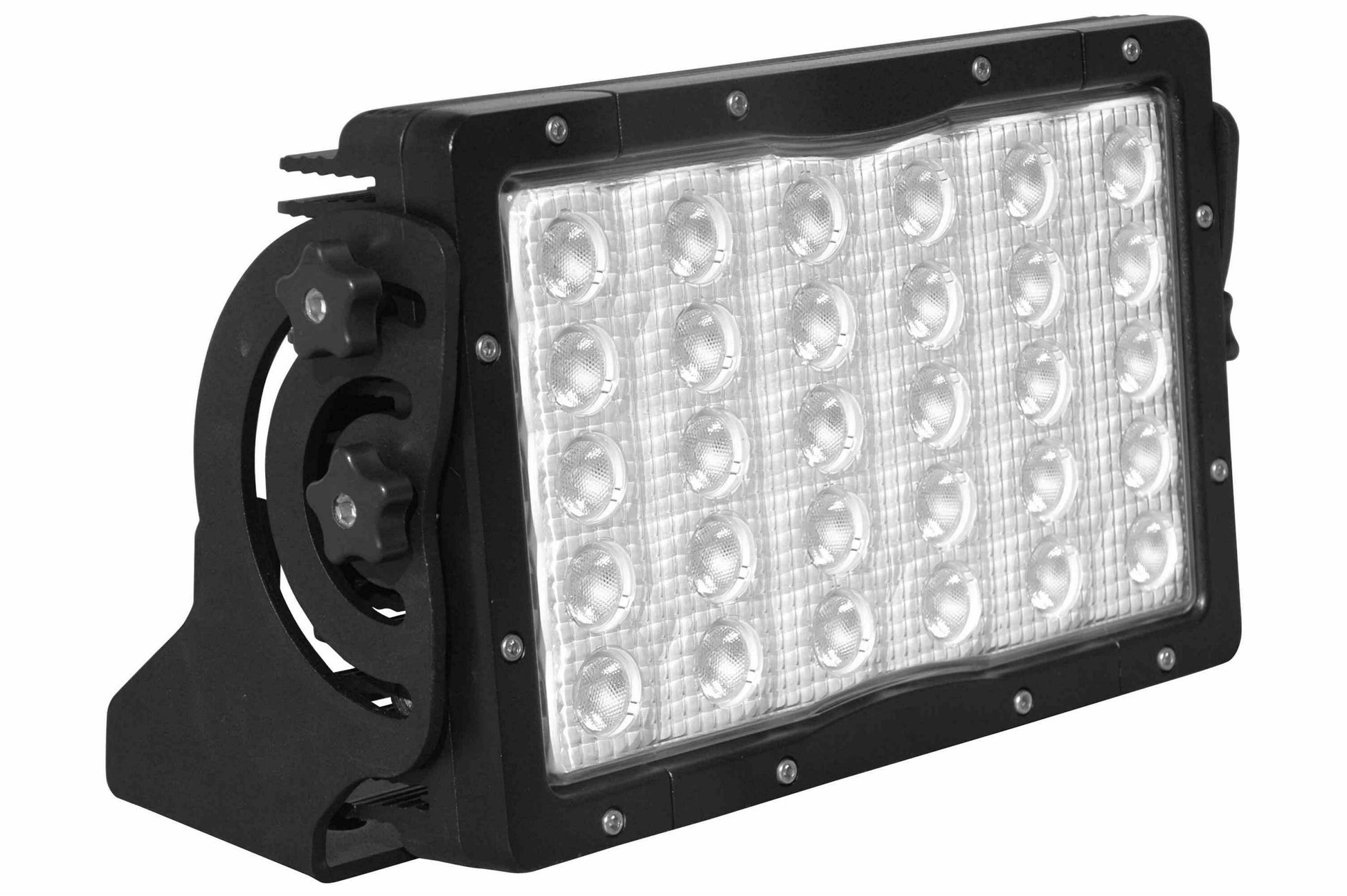 Each unit is equipped with an innovative trunnion style mounting bracket that allows the light to be attached to flat surfaces and adjusted through 360 degrees of vertical movement. To adjust the unit after mounting, the user simply loosens the thumb screws located on either side of the unit, moves it into the desired position, then retightens the screws. The base of the mounting trunnion is equipped with several machined slots which allow users to utilize existing mounting holes and slide the unit for precise mount positioning.