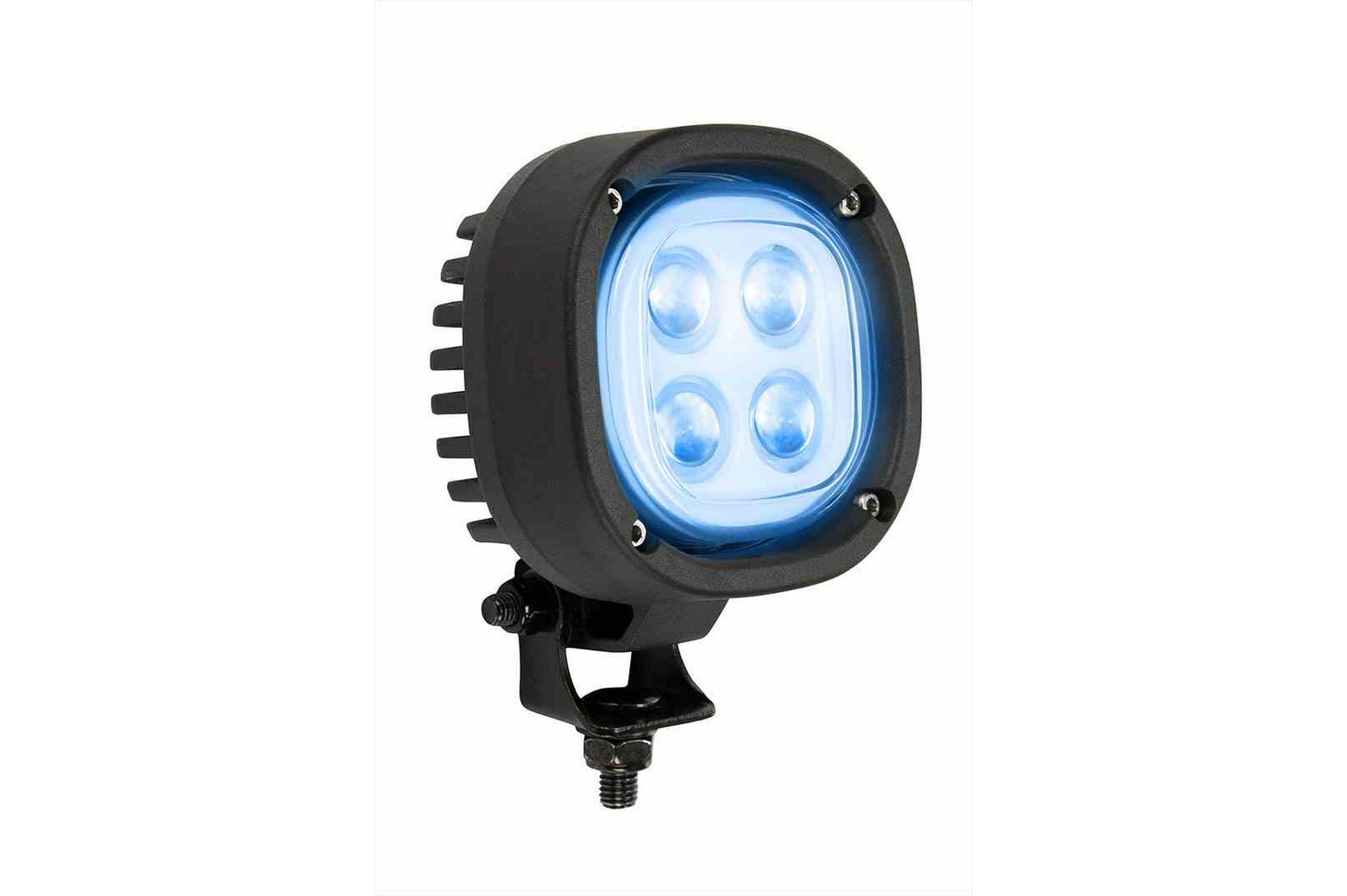 The LEDWL-FKLT-BLUE Blue LED Forklift Safety Light from Larson Electronics produces 1800 lumen of sharp blue light while drawing 1.67 amps from a 12 volt electrical system. Four 5-watt blue LED producing 450 lumens each are combined with high output parabolic reflector to produce a narrow 5° degree spread spot beam, providing a high intensity center beam which is visible during daytime and nighttime operations. This particular unit is ultra compact at only 6" tall by 3.91" wide by 3.36" deep, which makes it ideal for applications where electrical power and mounting space is at a premium.