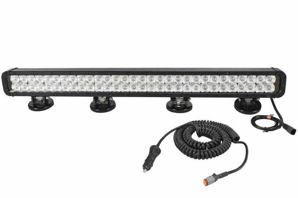 Buy American Compliant The Larson Electronics LEDLB-60E-M LED Light Bar offers high light output and extreme durability combined with a versatile magnetic mounting system that provides convenience and secure attachment to vehicles, equipment and any flat metallic surface. This IP68 rated LED light bar is waterproof to three meters and produces 10,800 lumens while drawing only 180 watts of power @15 amps from a 12 volt electrical system. This light can run on any voltage from 9 to 42 volts and provides an extremely rugged lighting solution that is ideal for use in commercial marine environments as well as industrial and manufacturing applications such as machine vision system lighting, heavy equipment illumination, blasting lighting and mining operations.   The LEDLB-60E-M LED light bar from Larson Electronics produces a 1450` long by 240` wide light beam with 10,800 lumens of bright light while drawing only 180 watts @15 amps from a 12 volt electrical system. Sixty Edison Edixeon® Emitters containing CREE EZBright® three watt LEDs producing 180 lumens each are paired with high purity 10 degree optics to produce a tightly focused spot beam with limited spread or light spillage. We also offer optional floodlight versions with 35 degree optics to produce a wider beam spread and more light over a larger area nearer the fixture, making flood versions ideal for use as work and area lights. These LED light bars are IP68 rated and waterproof to 3 meters, sealed against intrusion by dust and dirt and very ruggedly constructed to withstand the most demanding environments, conditions and applications. The entire Larson Electronics LEDLB-E series are constructed of extruded aluminum and feature heavier housings, rubber isolated mounts and unbreakable polycarbonate lenses to provide increased durability against vibrations, impacts, waves, hard rains, sand and high winds. This particular fixture comes equipped with 4, 150lb. grip magnetic bases and a 16 foot coil cord ending in a cigarette plug connector. This magnetic base mounting system allows fast and easy setup of this light on vehicles and equipment and will hold the fixture in place at speeds up to 80 mph provided the mount is properly affixed and secure.