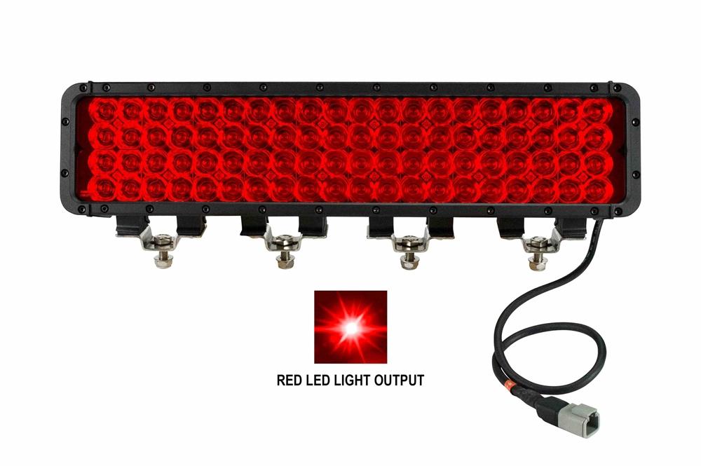 Buy American Compliant The Larson Electronics LEDLB-80X2E-RED LED Light Bar offers high light output and extreme durability combined with versatile mounting and power options. This IP68 rated LED light bar is waterproof to three meters and produces 14,400 lumens while drawing only 240 watts of power @20 amps from a 12 volt electrical system. This light can run on any voltage from 9 to 42 volts and provides an extremely rugged lighting solution that is ideal for use in commercial marine environments as well as industrial and manufacturing applications such as machine vision system lighting, heavy equipment illumination, blasting lighting and mining operations.   The LEDLB-80X2E-RED LED light bar from Larson Electronics produces a 1750` long by 300` wide light beam with 14,400 lumens of bright light while drawing only 240 watts @20 amps from a 12 volt electrical system. Eighty, three watt red LEDs producing 180 lumens each are arranged in rows and paired with high purity 10 degree optics to produce a tightly focused spot beam with limited spread or light spillage. We also offer optional floodlight versions with 35 degree optics to produce a wider beam spread and more light over a larger area nearer the fixture, making flood versions ideal for use as work and area lights. These LED light bars are IP68 rated and waterproof to 3 meters, sealed against intrusion by dust and dirt and very ruggedly constructed to withstand the most demanding environments, conditions and applications. The entire Larson Electronics LEDLB-E series are constructed of extruded aluminum and feature heavier housings, rubber isolated mounts and unbreakable polycarbonate lenses to provide increased durability against vibrations, impacts, waves, hard rains, sand and high winds.