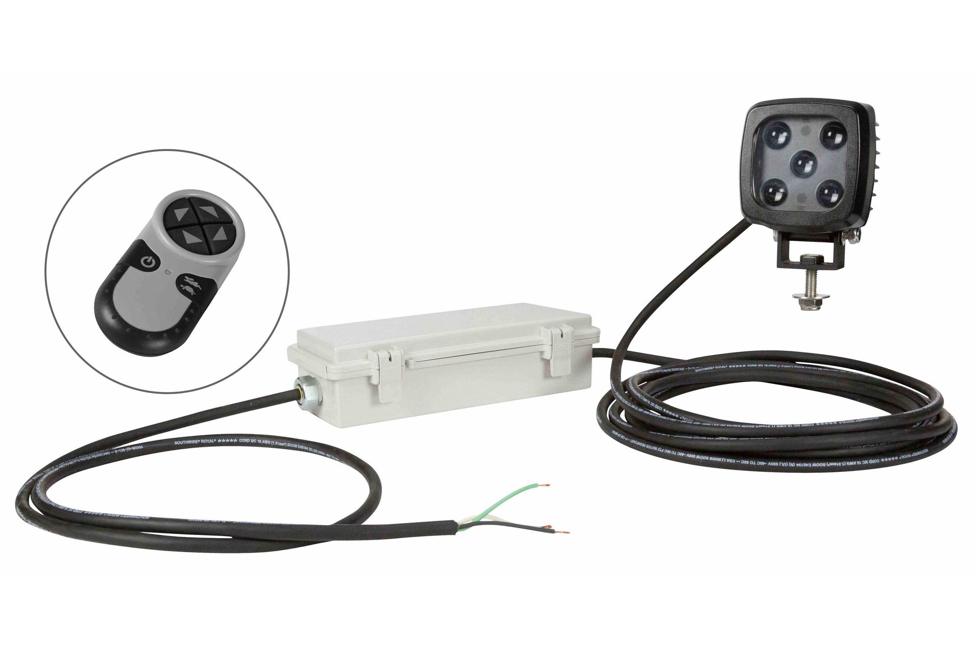 The LEDWL-GRN-1227-WR LED spotlight is equipped with Deustch connector and a 20` wiring harness. The external power supply is remote mountable. Operators can install the power supply between the light and the control station. The external power supply is designed to be hardwiGreen and operates on voltages ranging from 120-240V AC. The LEDWL-GRN-1227-WR comes with a wireless remote control that allows operators to turn the fixture on or off with the ease of a button press on the remote.