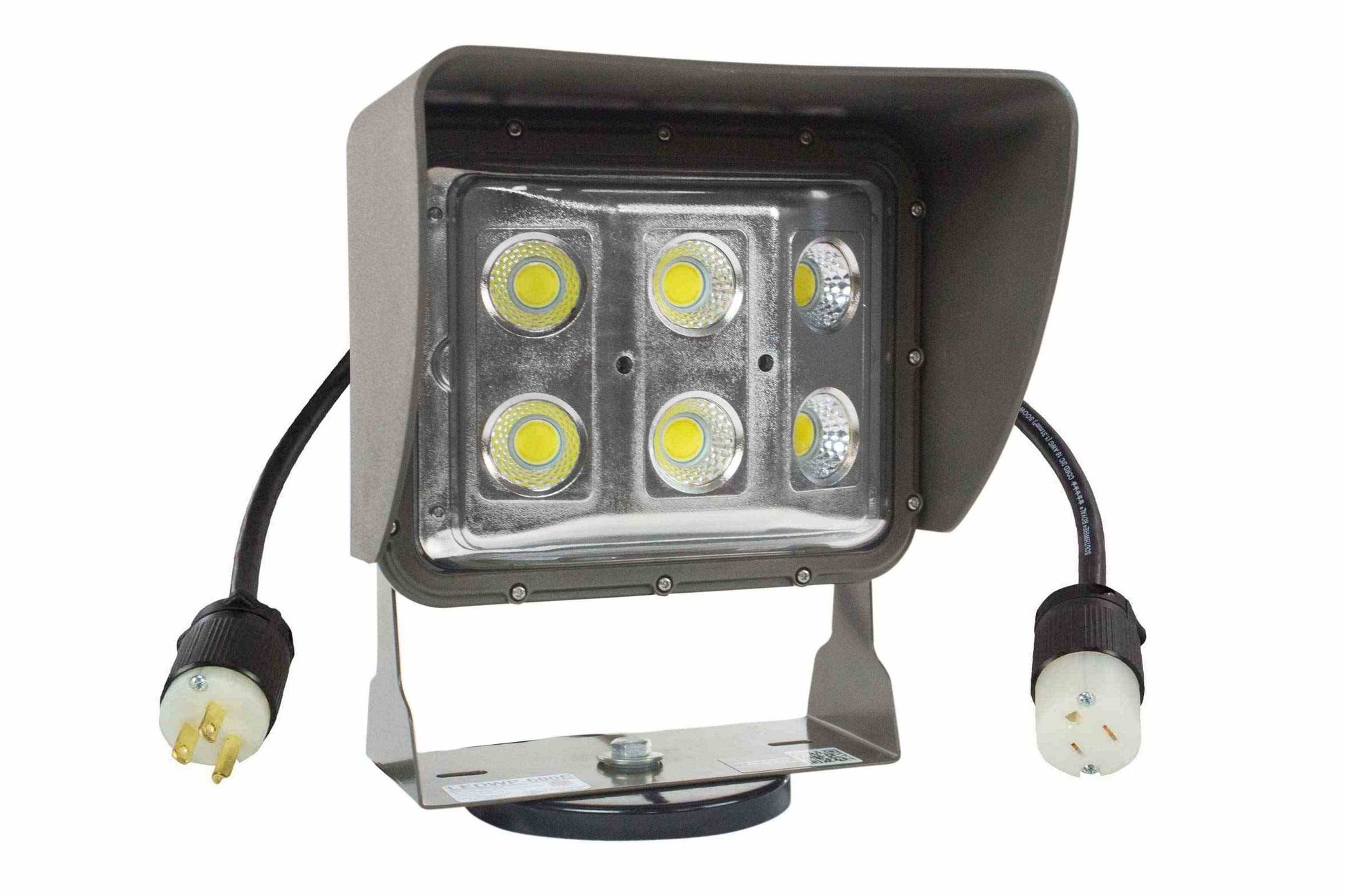 This LED flood lighting system is equipped with 1 foot of 16/3 chemical and abrasion resistant SOOW cord that is fitted with an industrial grade cord cap for easy connection to common wall outlets. Plug options include standard 5-15 15 amp straight blade plug for 110V wall outlets with ground, standard 6-15 15 amp straight blade plug for 220-240V wall outlets with ground, NEMA L5-15 15 amp twist lock plug for 125V twist lock outlets, NEMA L6-15 15 amp twist lock plug for 240V twist lock outlets, British BS1363 13 amp fused 3-blade plug for United Kingdom outlets, or a two pin 16 amp rated Schuko plug with ground contact and socket for European outlets up to 250V. Alternatively, we can provide flying leads with no plug for hard wire applications or for operators who prefer to wire in user provided cord caps. Please choose pigtail option below for flying leads with no plug. Each LEDWP-600E-M-E2E-1C comes with a 1 foot line out cord equipped with a connector allowing the lamp to be daisy chained to additional units.