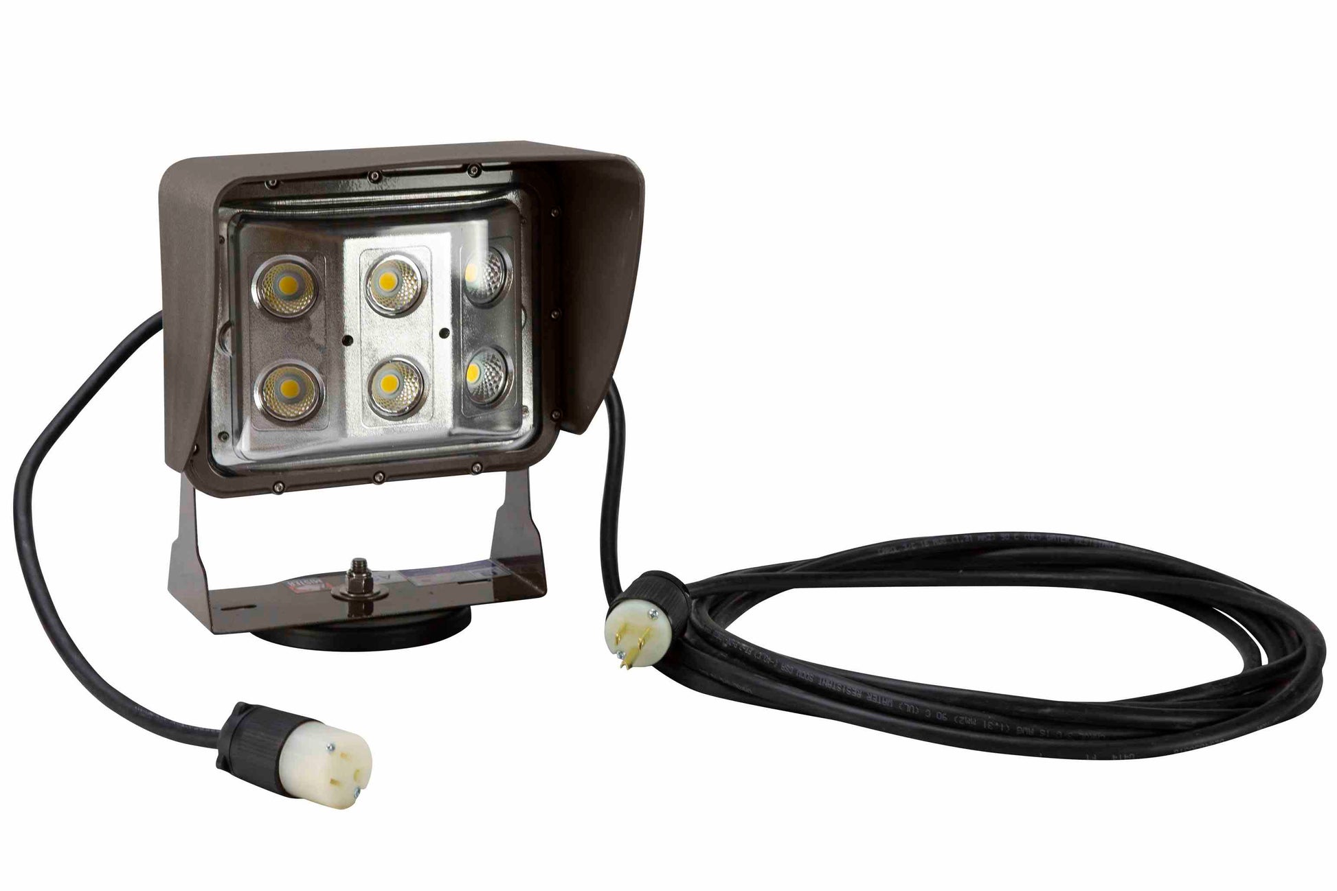 This LED flood lighting system is equipped with 20 foot of 16/3 chemical and abrasion resistant SOOW cord that is fitted with an industrial grade cord cap for easy connection to common wall outlets. Plug options include standard 5-15 15 amp straight blade plug for 110V wall outlets with ground, standard 6-15 15 amp straight blade plug for 220-240V wall outlets with ground, NEMA L5-15 15 amp twist lock plug for 125V twist lock outlets, NEMA L6-15 15 amp twist lock plug for 240V twist lock outlets, British BS1363 13 amp fused 3-blade plug for United Kingdom outlets, or a two pin 16 amp rated Schuko plug with ground contact and socket for European outlets up to 250V. Alternatively, we can provide flying leads with no plug for hard wire applications or for operators who prefer to wire in user provided cord caps. Please choose pigtail option below for flying leads with no plug. Each LEDWP-600E-M-E2E-20C comes with a 1 foot line out cord equipped with a connector allowing the lamp to be daisy chained to additional units.