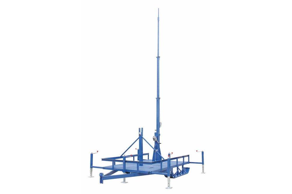 The LM family of telescoping towers feature a proprietary mast guidance system, which provide increased stability during high winds. Four 1,000 lbs hand crank leveling jacks are used for leveling. The jacks can be leveled by hand crank or attachment provided for power drills. These outriggers can be extended 2` out from the side of the trailer for added stability. When lowered to 13.5`, the mast can withstand winds up to 125 mph. Three additional 1,000lb jacks help prevent the skis and tongue from freezing to glaciers, or to help break the trailer and skis free after already frozen.