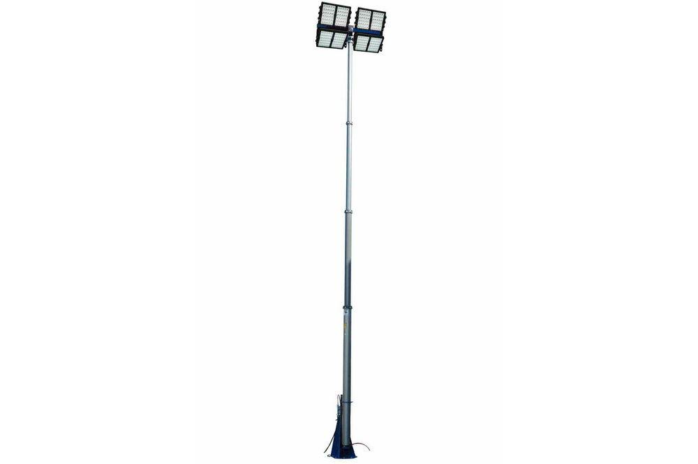 Included with this light tower are four of our wet area suitable LEDP5W-60-1227 LED fixtures producing a combined total of approximately 118,320 lumens at only 1200 watts. Each fixture produces 29,580 lumens of high intensity light while drawing only 300 watts @2.5 amps from a 120 volt electrical system. Sixty CREE XLamp XPG® five watt LEDs producing 493 lumens each are arranged in rows and paired with high purity optics to produce a well focused 25 degree beam that is ideal for providing far reaching concentrated illumination while still covering a substantial amount of area. We also offer optional floodlight versions with a 60 degree beam spread to provide more light over a larger area nearer the fixture, making flood versions ideal for use as dedicated work and area lights. These LED lights are waterproof to 3 meters, sealed against intrusion by dust and dirt, and very ruggedly constructed to withstand the most demanding mining environments, conditions and applications. The PLM series of towers are powder coated with an industrial finish for corrosion resistances and aesthetics. These light masts are typically mounted to trailers or other stable surfaces via a 15" by 13" by 1/4" thick mounting base-plate which has been drilled to accept six 1/2" anchor bolts. A 44" wide and 2" by 2" by 1/4" thick mounting plate is attached to the upper section of the mast which provides a strong and stable platform for the equipped LED light fixtures. When lowered to 14`, the mast can withstand winds up to 80 mph. This light tower weighs approximately 275 lbs and can easily support and lift 150 lbs fixtures. The entire tower assembly is shipped via common freight carrier and when shipped measures approximately 16.5` long, 4` wide, 5` tall and weighs approximately 500 lbs. Larson Electronics can custom tailor these units to the customer’s requirements with longer sections and larger mounting plates. Suggested Applications: Temporary lighting, construction sites, and security camera deployment. We can equip this mast with 1000W or 1500W Metal Halide lights or a wide variety of high powered LED lights with comparable power, including the , , or .