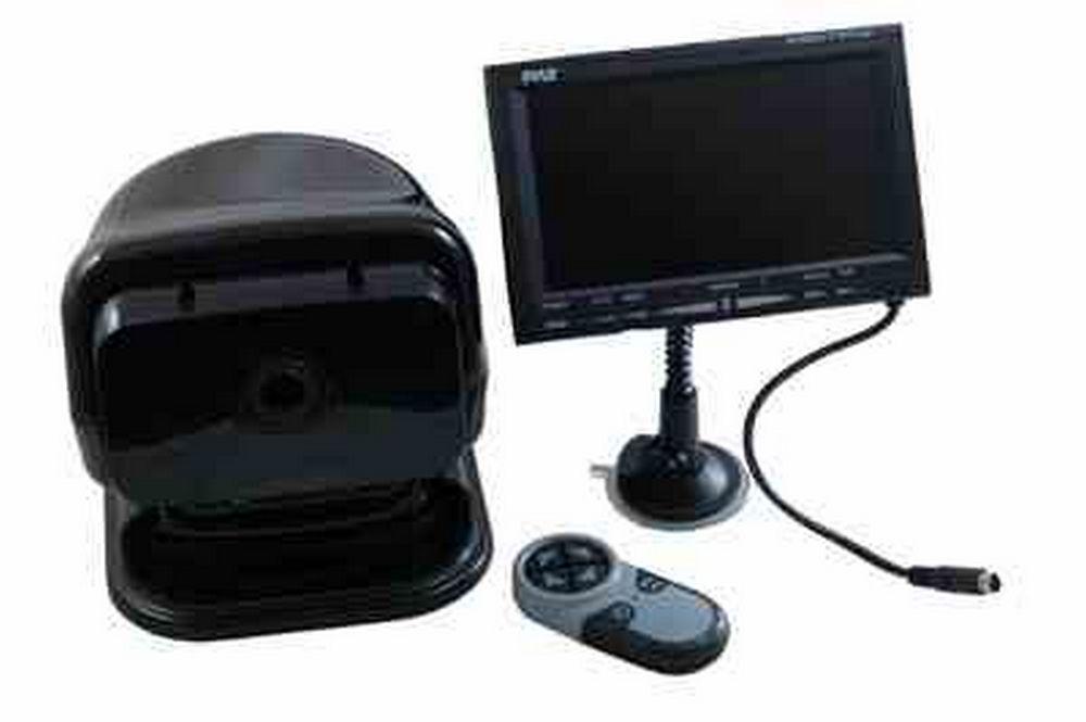 The remote controlled thermal imaging infrared camera system with 6 inch LCD monitor is available with wireless or wired remote controls. The wireless versions are available with radio based handheld and dash mount remote controllers. The hard wired version of the remote controlled thermal imaging camera includes a 20 foot harness and dash mount, joystick style controller.  All controller choices offer left, right, up and down motor control as well as fast and slow motor speed control. The operator can also turn the camera on and off from the controller.