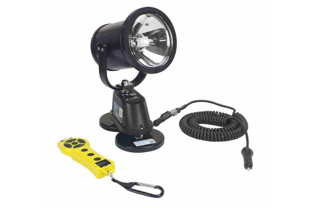 Motorized remote control spotlight with 50 Watt High Intensity Discharge (HID) light, magnetic base and 16 foot coil cord with cigarette plug. This remote controlled work light produces 4500 lumens and produces a high powered spotlight beam to 4,100 feet. Alternatively, this HID light can be configured with a flood lens, producing a soft, wide beam covering an area 425 feet in width and length. The RCL360-HID-RF-M is a remote controlled, industrial grade HID spotlight, producing 4500 lumens (equivalent to 1,000,000 industrial candlepower rating and a 15 million retail candlepower rating). This remote controlled HID spotlight produces an 4100 foot beam with a 50 watt HID bulb and ballast combination. This motorized spotlight is controlled via a handheld wireless remote control that offers 4 directional buttons and an on/off switch for the light beam itself. The two 200 pound grip magnetic bases hold the light securely to any ferrous metal surface even at driving speeds. The detachable 16 foot coil cord with cigarette plug brings power to the light.