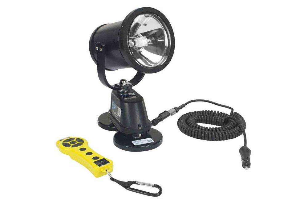 This magnetic mount, wireless remote controlled spotlight attaches to any ferrous metal surface and connects to the power via a 16 foot coil cord with cigarette plug.