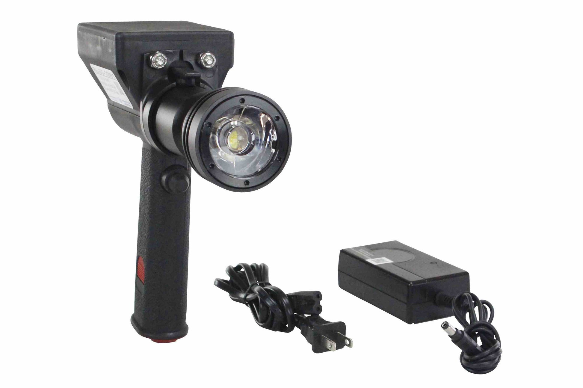 This light weight, 10 watt LED spotlight is ergonomically designed to produce a well balanced and easily managed handheld light source that can withstand abuse under tactical conditions and operate for 5 hours on a single charge of its integrated lithium ion battery pack. This light contains a single 10 watt LED rated at 120,000 hours of operational life which is paired with a patent pending reflector design to produce a light beam that reaches 1500 feet in length and 100 feet in width. The beam has a 4-degree spot optic, which results in a very tight, pencil beam light output, ideal for far distances. This beam is strong enough to allow operators to read signs, license plates, addresses and other similar markings at the far end of its total range.