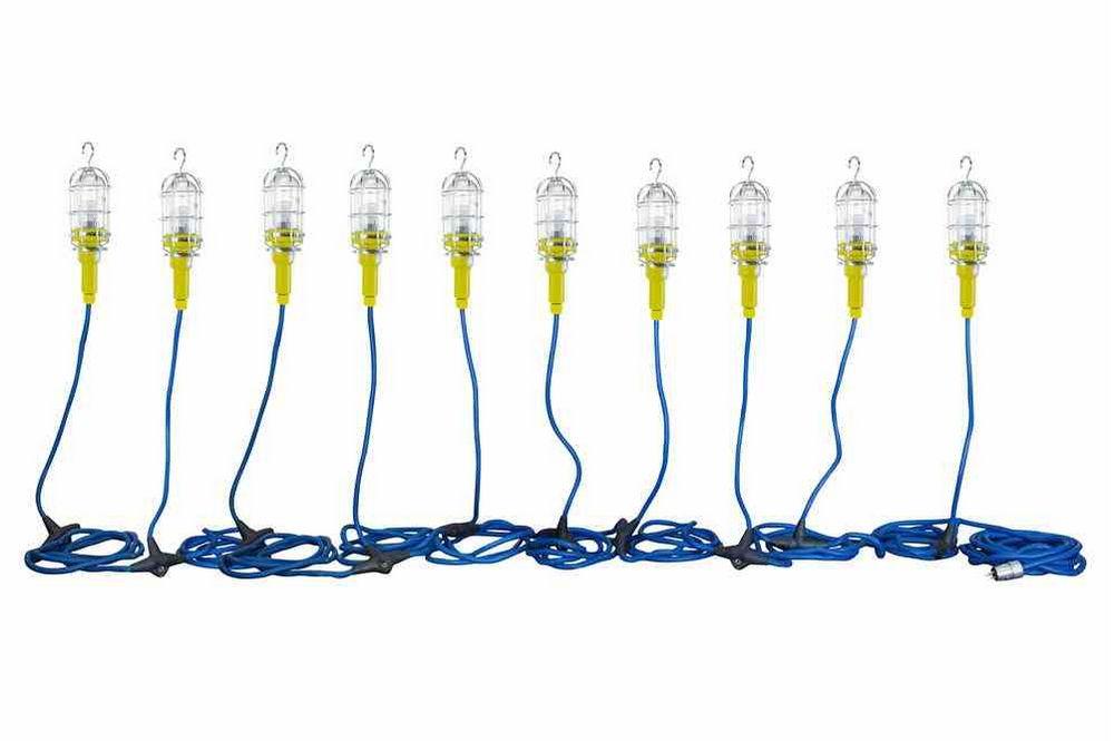 These vapor proof lights are water tight and suitable for use in wet locations. Each light has a stainless steel mesh guard enclosure that provides protection for the glass dome and a stainless hook that allows operators to hang these tasks lights overhead. In order to meet OSHA regulations, this vapor proof LED string light must be plugged into a GFI protected outlet. Each vapor proof LED string light is equipped with an outlet, enabling the operator to connect several strings together. There are limits to how many strings can be interconnected based on the overall amp draw, power source, etc. Each LED trouble light has an effective range that approximately covers a 5 to 8 foot radius with 10-15 foot candles of light.