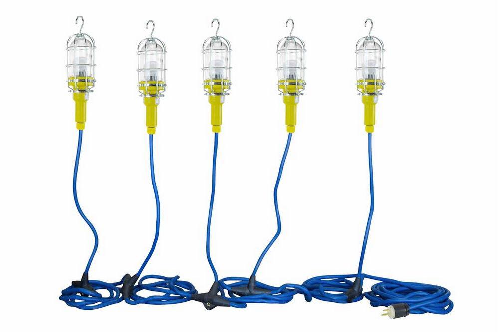 These vapor proof lights are water tight and suitable for use in wet locations. Each light has a stainless steel mesh guard enclosure that provides protection for the glass dome and a stainless hook that allows operators to hang these tasks lights overhead. In order to meet OSHA regulations, this vapor proof LED string light must be plugged into a GFI protected outlet. Each vapor proof LED string light is equipped with an outlet, enabling the operator to connect several strings together. There are limits to how many strings can be interconnected based on the overall amp draw, power source, etc. Each LED trouble light has an effective range that approximately covers a 5 to 8 foot radius with 10-15 foot candles of light.