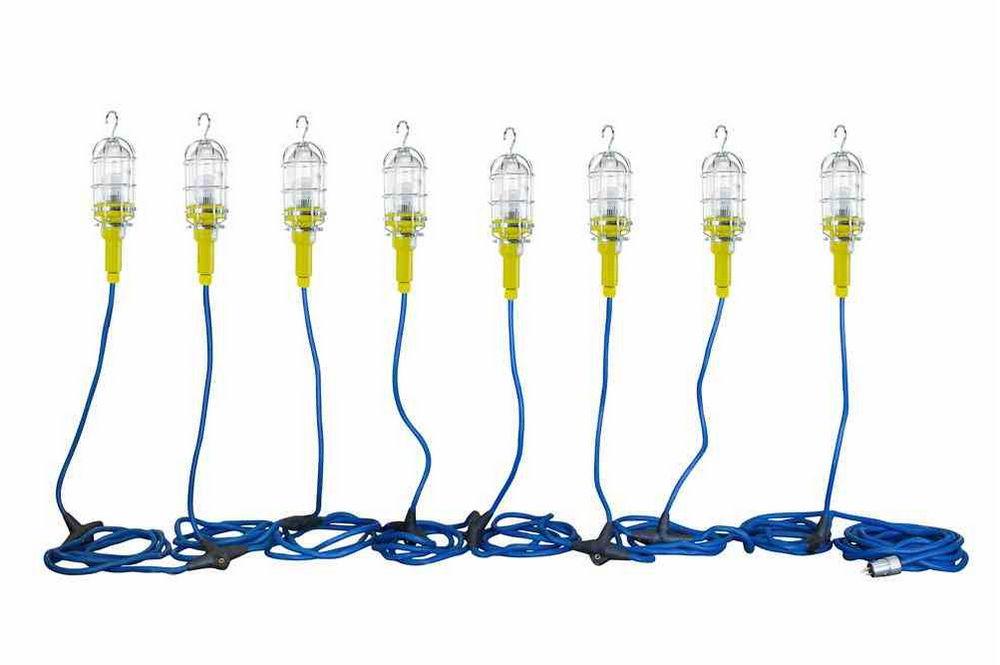 These vapor proof lights are water tight and suitable for use in wet locations. Each light has a stainless steel mesh guard enclosure that provides protection for the glass dome and a stainless hook that allows operators to hang these tasks lights overhead. In order to meet OSHA regulations, this vapor proof LED string light must be plugged into a GFI protected outlet. Each LED trouble light has an effective range that approximately covers a 5 to 8 foot radius with 10-15 foot candles of light. LED Benefits: Unlike gas burning and arc type lamps that have glass bulbs, LEDs have no filaments or fragile housings to break during operation and/or transportation. Instead of heating a small filament or using a combination of gases to produce light, light emitting diodes (LEDs) use semi-conductive materials that illuminate when electric current is applied, providing instant illumination with no warm up or cool down time before re-striking. Because there is no warm up period, this light can be cycled on and off with no reduction in lamp life. LED lights run at significantly cooler temperatures than traditional metal halide and high pressure sodium lights and contain no harmful gases, vapors, or mercury, making them both safer and more energy efficient. No extra energy is wasted in cooling enclosed work areas due to external heat emissions from bulb type lights, and the operator risks associated with traditional lighting methods, such as accidental burns and exposure to hazardous substances contained in the glass bulbs, are eliminated. In addition, LEDs are also safer for the environment as they are 100% recyclable, which eliminates the need for costly special disposal services required with traditional gas burning and arc type lamps.
