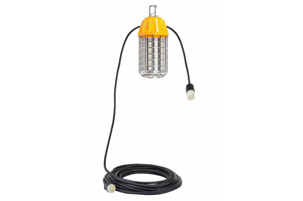 The Larson Electronics WAL-TJL-150W-LED-CPR-E2E-14.3-50.2C Temporary Work Area Lighting LED Light is a single 60-watt temporary job site fixture that replaces 150-watt metal halide and high-pressure sodium lamps. It features high voltage surge protection, a durable stainless-steel cage and hook with daisy chaining capabilities, and produces a total of 7,200 lumens of quality illumination, ideal for any construction or work area in need of an overhead temporary light source.