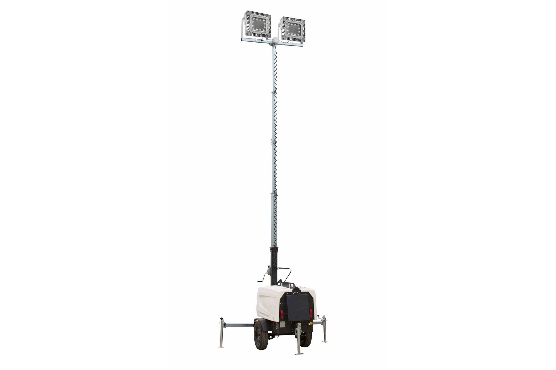 The telescoping boom consists of three sections extending up to 25 feet through the use of two manual self braking winches and allows for rotating the lights 360 degrees. One winch is mounted to the trailer tongue and acts to raise the tower into a vertical position while the other is mounted to the boom and is used to extend the tower to the desired height. The telescoping boom is constructed of galvanized steel to resist rusting and corrosion and is capable of withstanding 51 mph winds when extended to its full height and the stabilizing outriggers are deployed. The stabilizing outriggers are a three point design with one located under the trailer tongue and two on the rear sides of the unit. The two rear outriggers are adjustable and include 1,000 lbs. swivel jacks for leveling and stabilizing the tower.