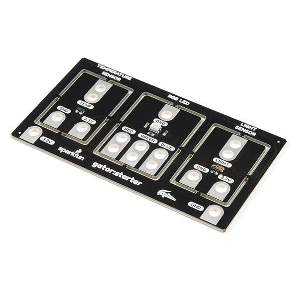 Included on each gator:starter is a temperature sensor board, a light sensor board and an RGB LED board. Since this is a ProtoSnap, weve broken out the power so it can be clipped to on the edge of the gator:starter to power the board without breaking each individual sensor or LED. Snapping the board apart can be easily done by twisting each of the LED boards side to side until it pops out and will need to be done if you want to light any of the LEDs on their own.