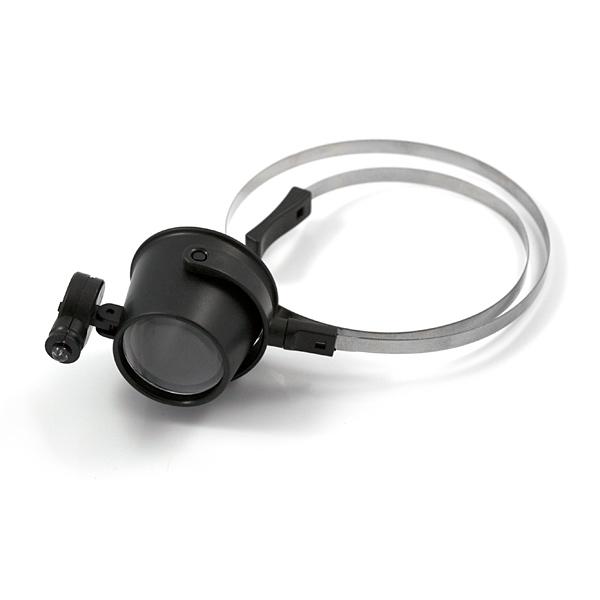 When working with small parts, sometimes you need magnification and some extra light. This is a monocle we use regularly in our production facility. It has a 10x lens with a working distance of about 1-1/2". The 1" diameter eye piece fits snugly around your eye with a 15" aluminum-core headband. The LED provides sufficient light at the working distance.
