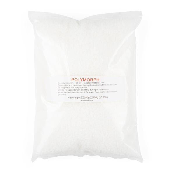 Polymorph is a non-toxic, biodegradable polyester with a low melting temperature of about 60°C (140°F). Prototype plastic parts can be made by simply heating the plastic beads in hot water until they turn clear and then kneading them together and shaping by hand. When it cools it becomes a nylon-like white plastic. Polymorph can be re-used by simply re-heating and re-shaping. Plastic beads are supplied in a re-usable plastic container.