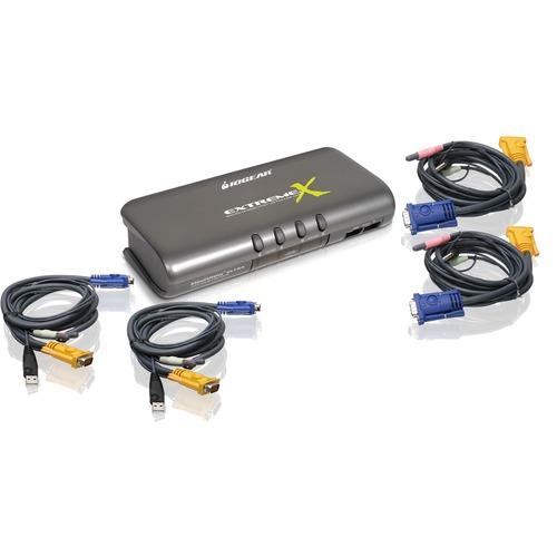 IOGEAR new MiniView Extreme Multimedia KVM and Peripheral Sharing Switch brings extra value to conventional KVM switches by offering USB peripheral sharing capabilities, audio and microphone support, and multi-platform support for Windows, Mac, and Sun systems using USB or PS/2(additional cables needed for PS/2, IOGEAR Part No. G2L5302P). You can save money and space by eliminating the need for multiple monitors, keyboards, mice, and peripheral devices such as printers, scanners, zip drives, and more. Up to 127 different USB devices can be daisy chained from this KVMP switch. Sharing speakers and a microphone also offers extra value and convenience for the users.