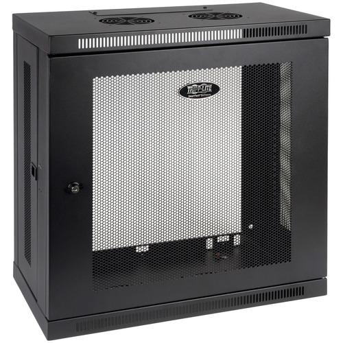 The SRW12U13 SmartRack 12U Low-Profile Patch-Depth Wall-Mount Rack Enclosure Cabinet is designed to house EIA-standard 19-inch rack equipment in network wiring closets, retail locations, back offices, classrooms and other areas with limited floor space where you need equipment to be secure, organized and out of the way. Constructed from heavy-duty steel with a durable black powder-coated finish, the cabinet has a maximum load capacity of 200 pounds.The side panels and front door lock securely to help prevent damage, tampering or theft. The front, top, bottom and removable side panels are vented, which allows air to flow freely and keep equipment cool. The reversible front door can open left or right by rotating the cabinet 180° before mounting. Convenient top and bottom ports allow easy cable routing. The SRW12U13 comes fully assembled and ready to mount to the wall, or use Tripp Lite's optional SRCASTER rolling caster kit to make it a mobile rack. Square and threaded mounting holes and numbered rack spaces make equipment installation easy. The vertical mounting rails adjust in 7/8-inch increments to accommodate equipment up to 13 inches deep, such as patch panels and shallow network switches.- Maximum load capacity of 200 lb.