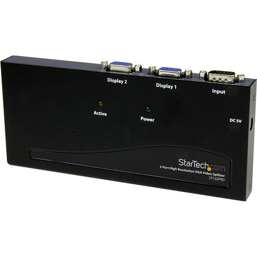 The ST122PRO 2 Port High Resolution VGA Video Splitter - 350 MHz splits a VGA video source signal to 2 monitors or projectors simultaneously - a professional grade solution that is perfect for presentations, classrooms, tradeshows, or in-store displays, where the highest quality video on several monitors is needed.This High Resolution VGA Splitter supports monitors with up to 350MHz of video bandwidth and display resolutions up to 2048x1536 @80Hz. For added versatility, the VGA splitter features an integrated booster circuit that allows the video signal to be extended up to 210 feet (65 meters), enabling you to situate your displays in the most convenient location based on your application.