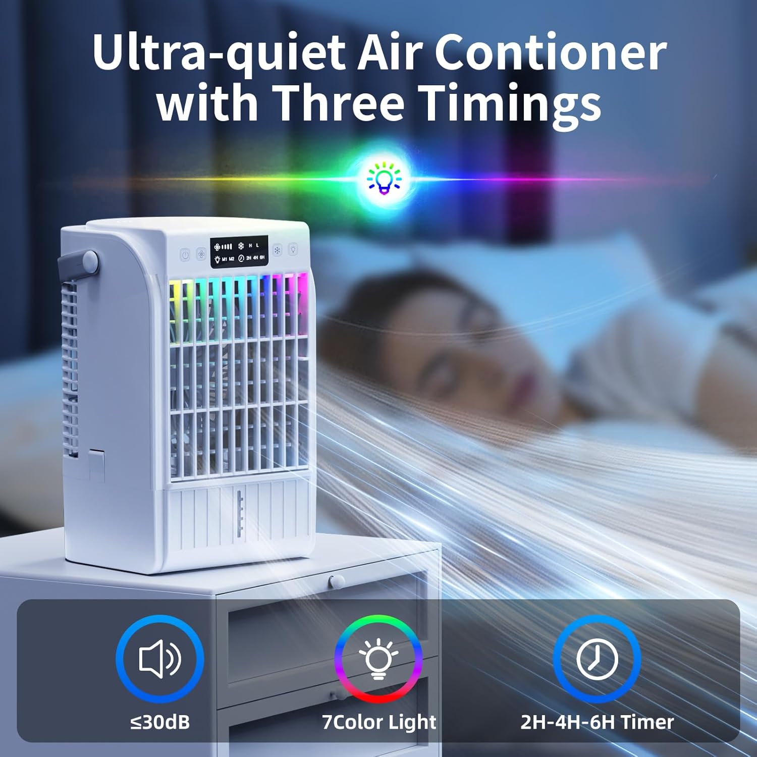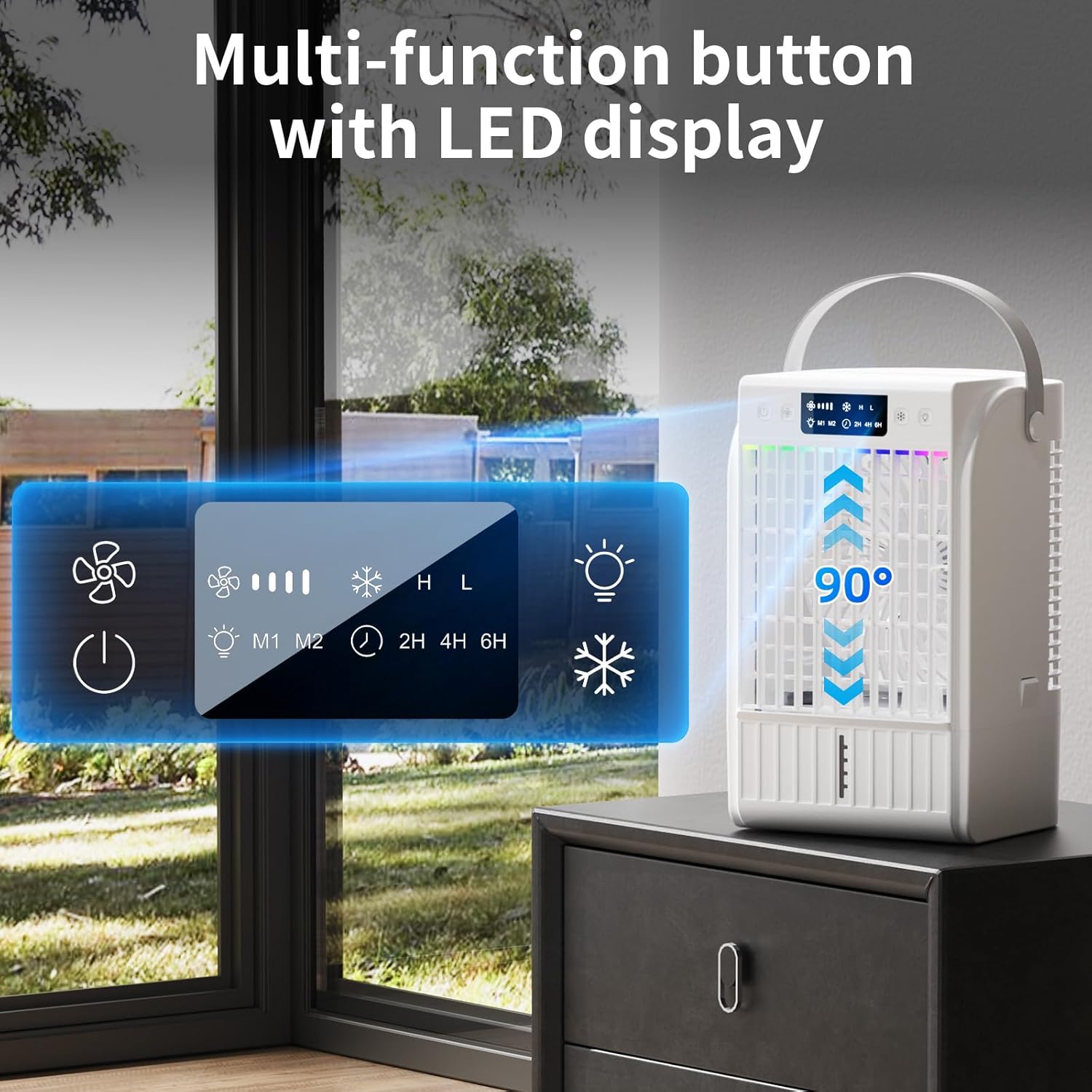 More than just a fan—this device combines a portable air conditioner, humidifier, nano mist cooler, and 7-color LED night light into one sleek unit. Add ice water and enjoy an instant chill effect as the unit rapidly drops the ambient temperature through precision airflow and mist diffusion.
