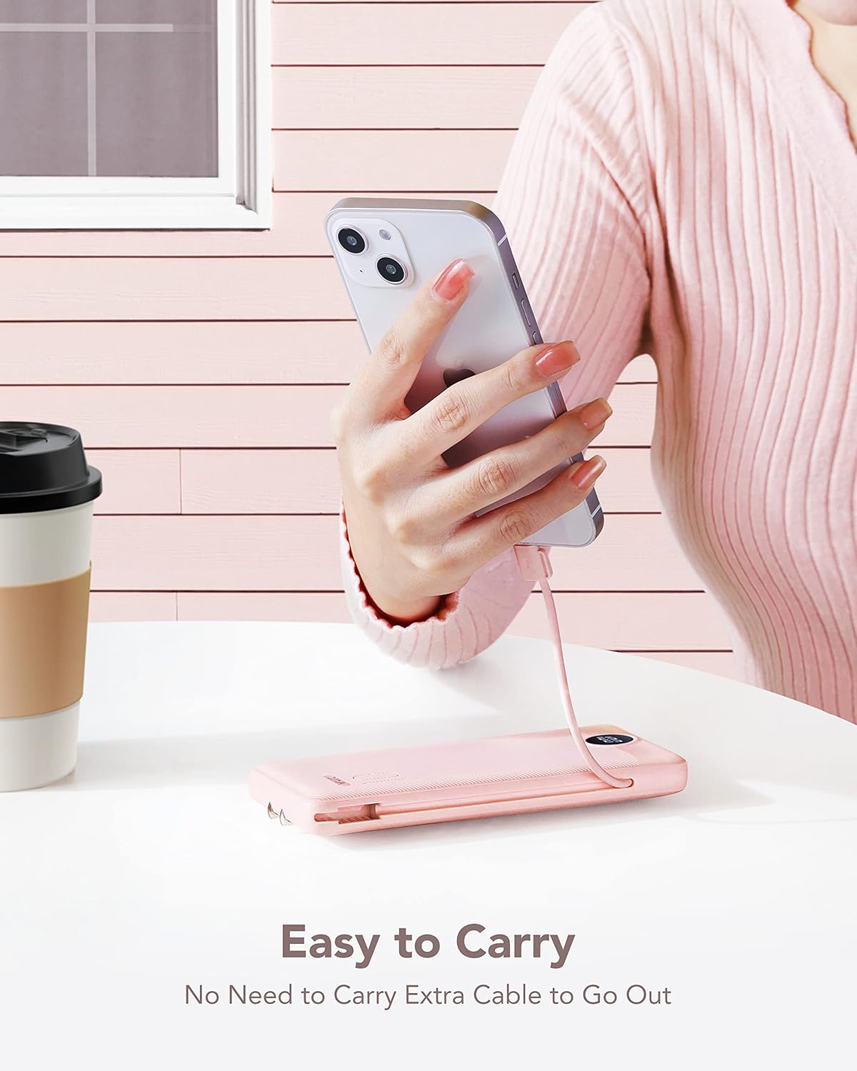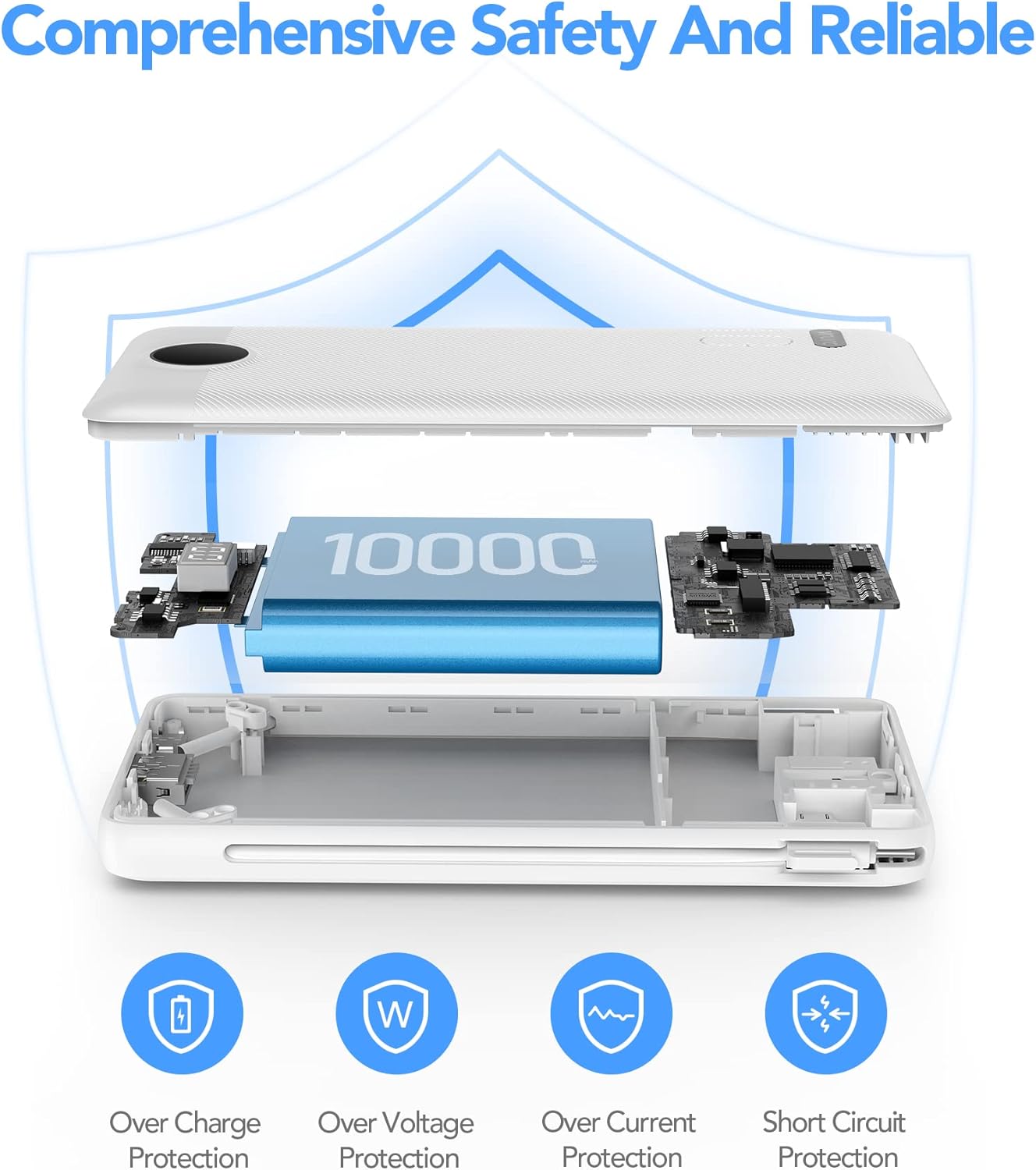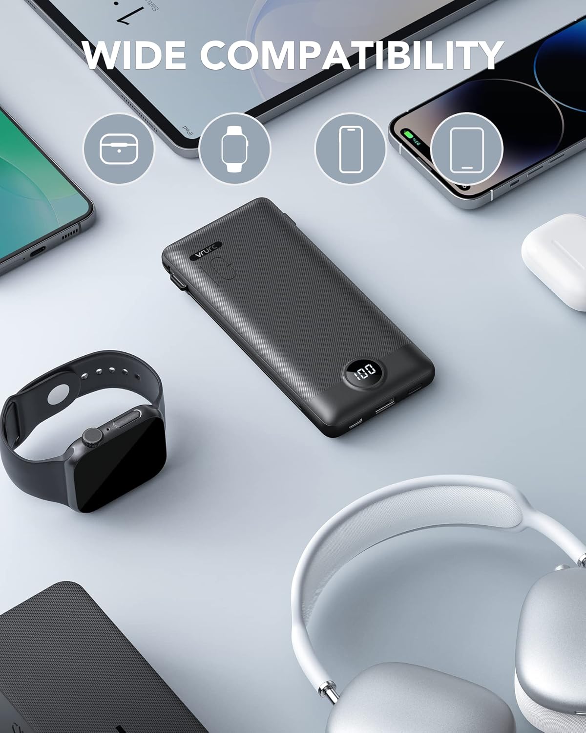 [High Capacity & Universal Compatibility] Boasting a 10,000mAh capacity, this USB-C portable charger can power your devices 2.5 to 4 times on a single charge, depending on the device. It's compatible with iPhones, Android devices, and most USB-C enabled gadgets using the built-in cables.