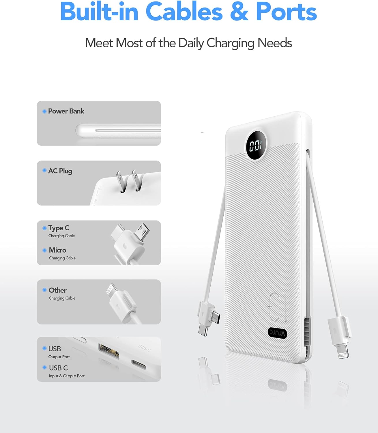 Portable Charger Built-in Cables and AC Wall Plug, VRURC USB C Power Bank 10000mAh, [2025 Upgraded Version] Phone Charger Compact Lightweight External Battery Pack for Smart Phones,Navy Blue