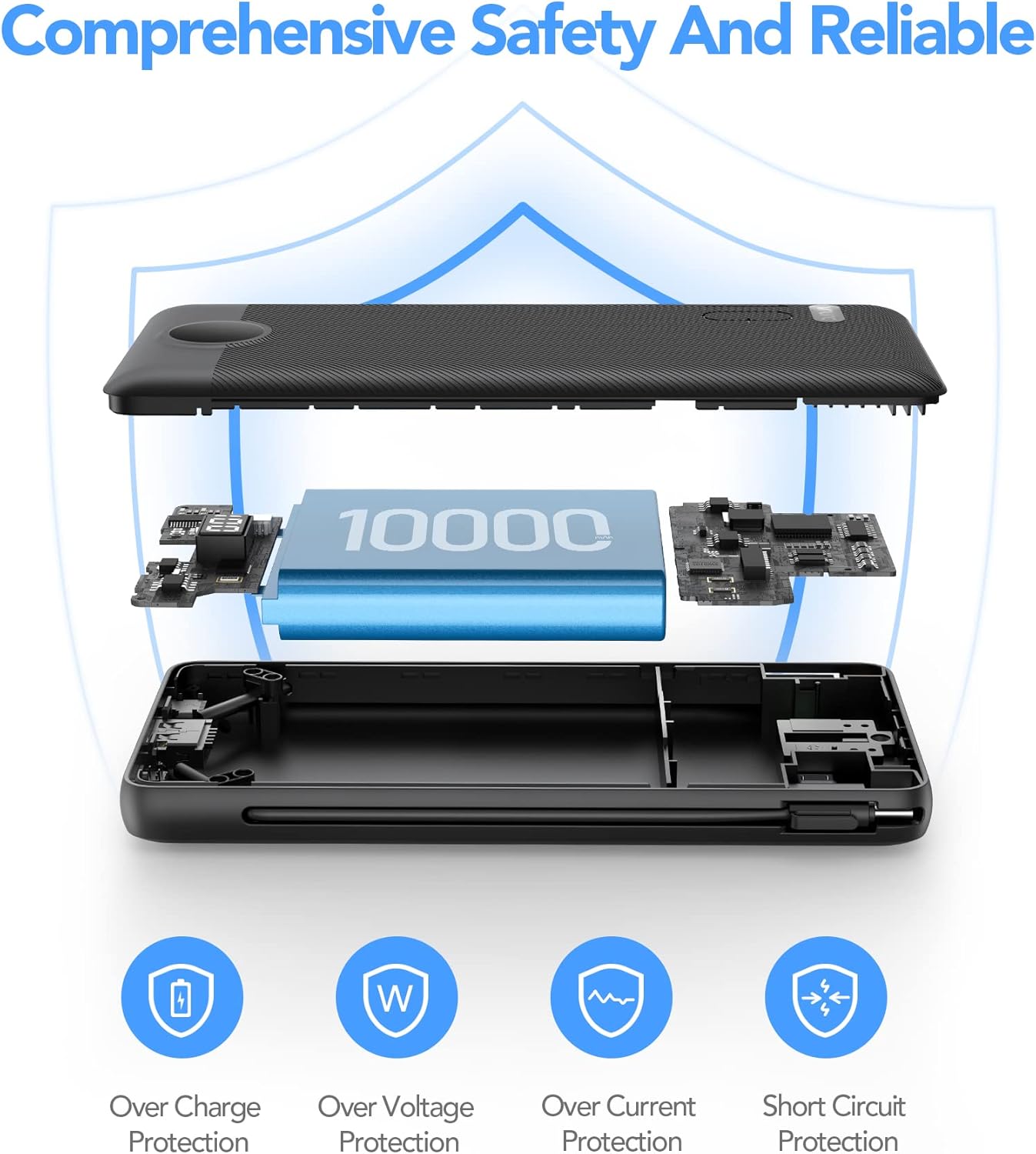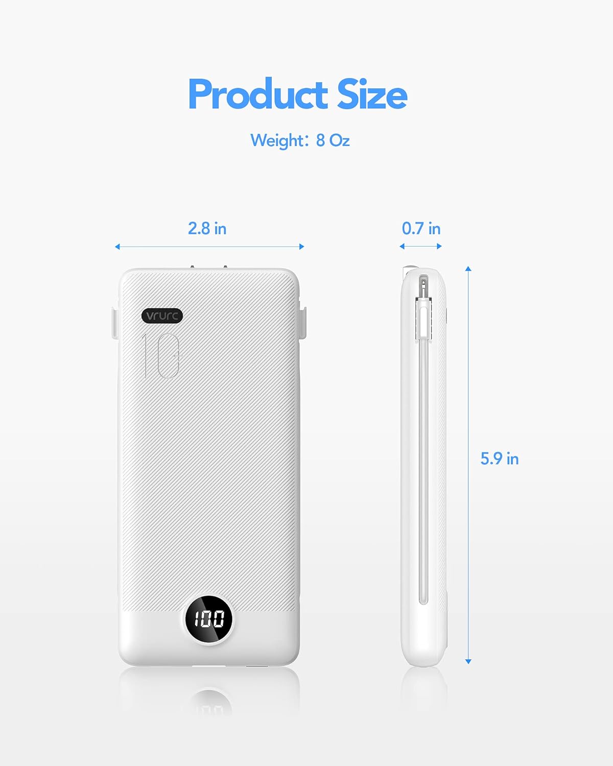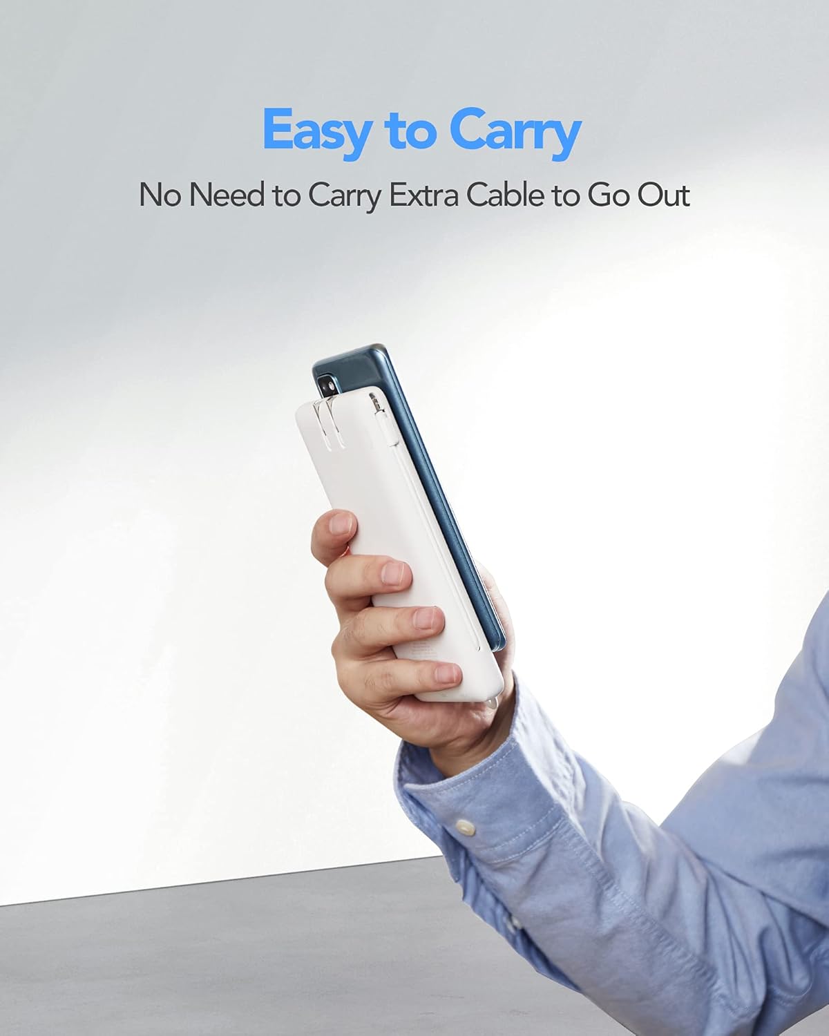 【Portable Charger With Built-in Charging Cables and Ports】This USB C portable charger not only has a built-in micro cable, type C cable, and other data cables, but also is equipped with a USB input port, Type-C input, and output ports. Using the built-in cables to charge, the portable battery charger is compatible with iPhone, Android devices, and USB-C most mobile phones and smart devices. This external battery power bank can meet most of the charging needs of daily life.