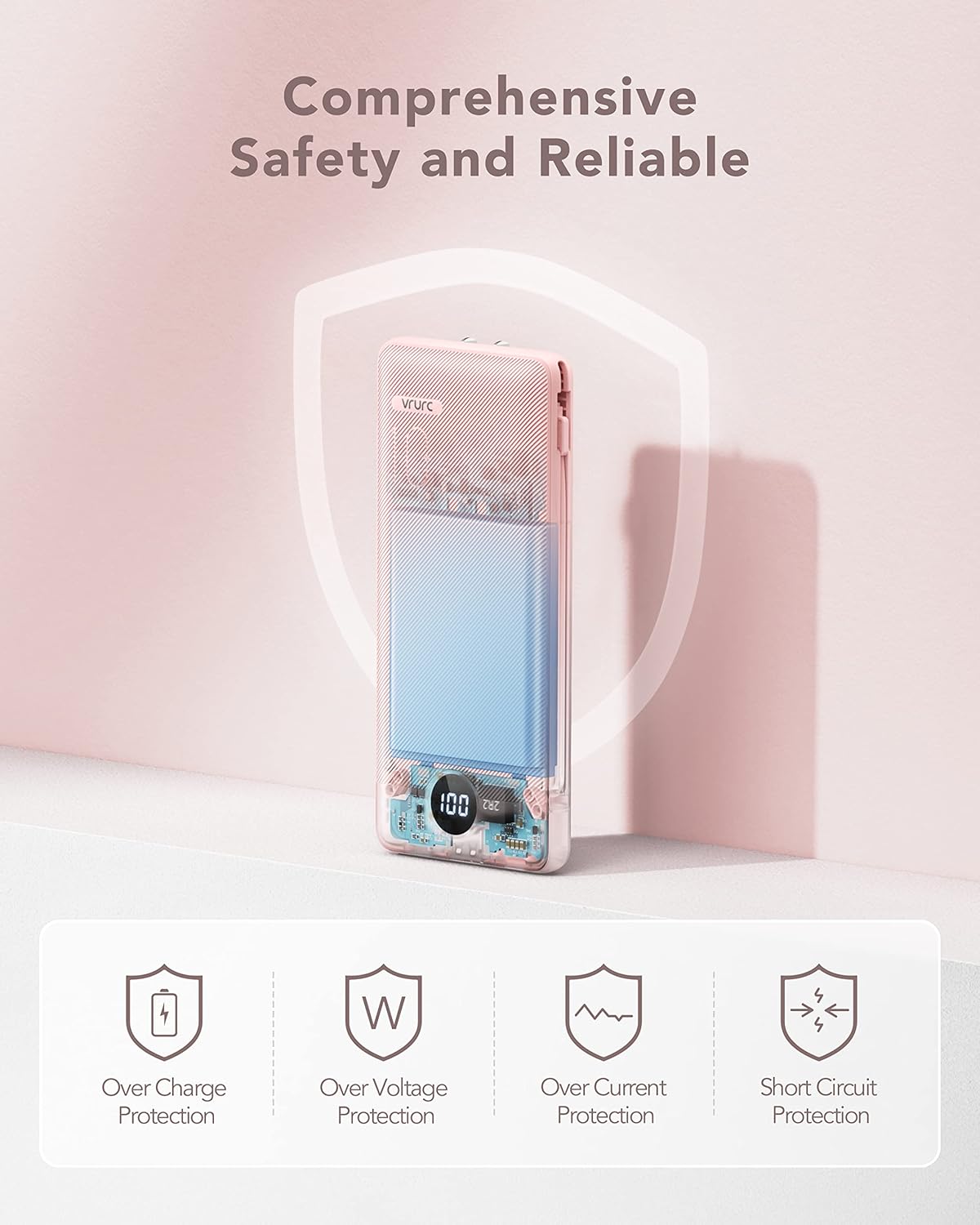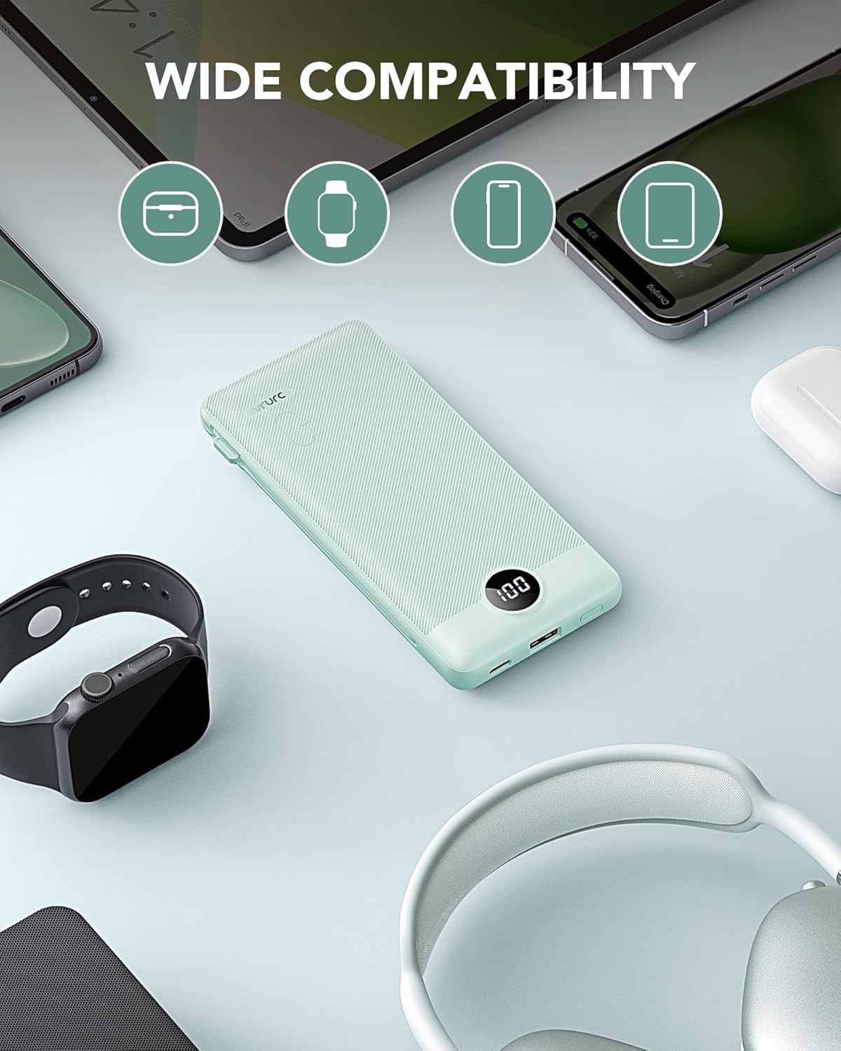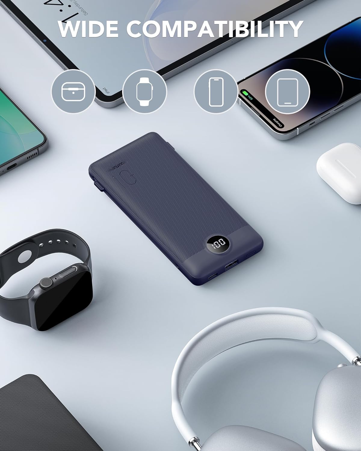 【Portable Charger With Built-in Charging Cables and Ports】This USB C portable charger not only has a built-in micro cable, type C cable, and other data cables, but also is equipped with a USB input port, Type-C input, and output ports. Using the built-in cables to charge, the portable battery charger is compatible with iPhone, Android devices, and USB-C most mobile phones and smart devices. This external battery power bank can meet most of the charging needs of daily life.